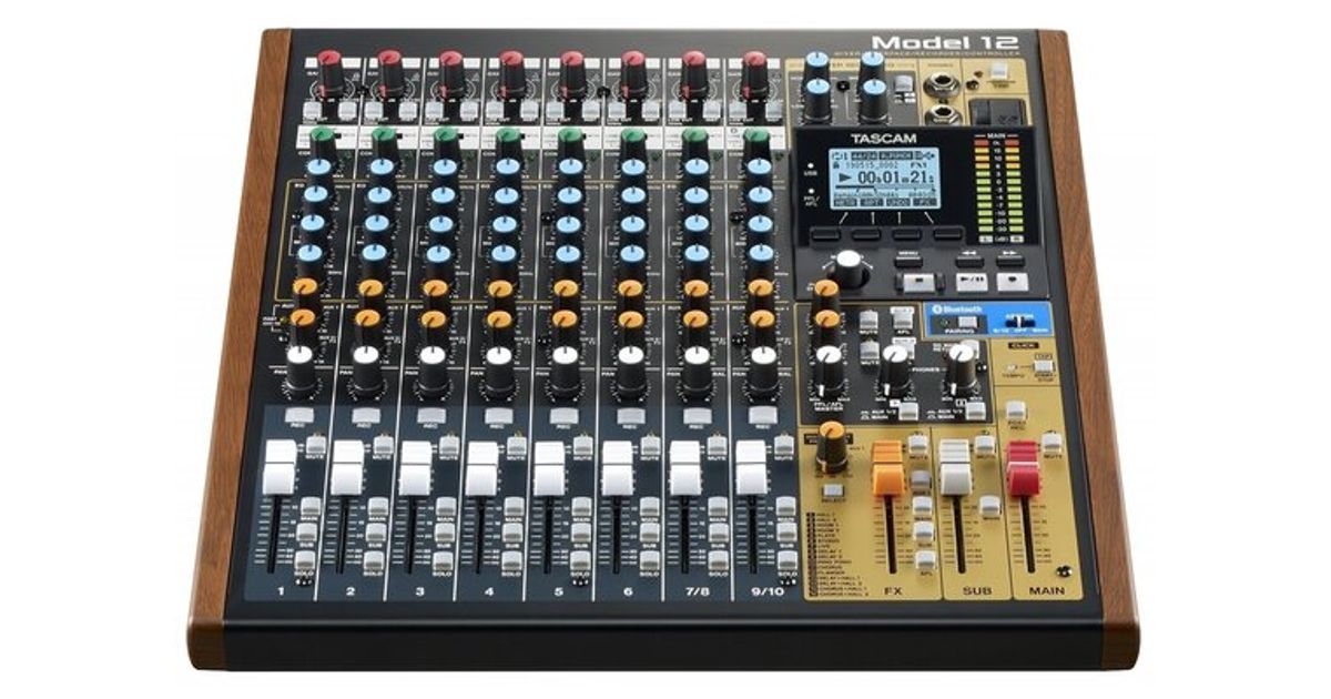 Tascam Model 12 is a compact all-in-one integrated mixing and recording suite designed for music and multimedia creators, songwriters and performers. It consists of a 10-input mixer, a 12-track version of the highly acclaimed Tascam multi-track audio recorder, USB audio interface, MIDI connectivity, DAW control functions, and unique podcasting capability including mix-minus and smartphone input.