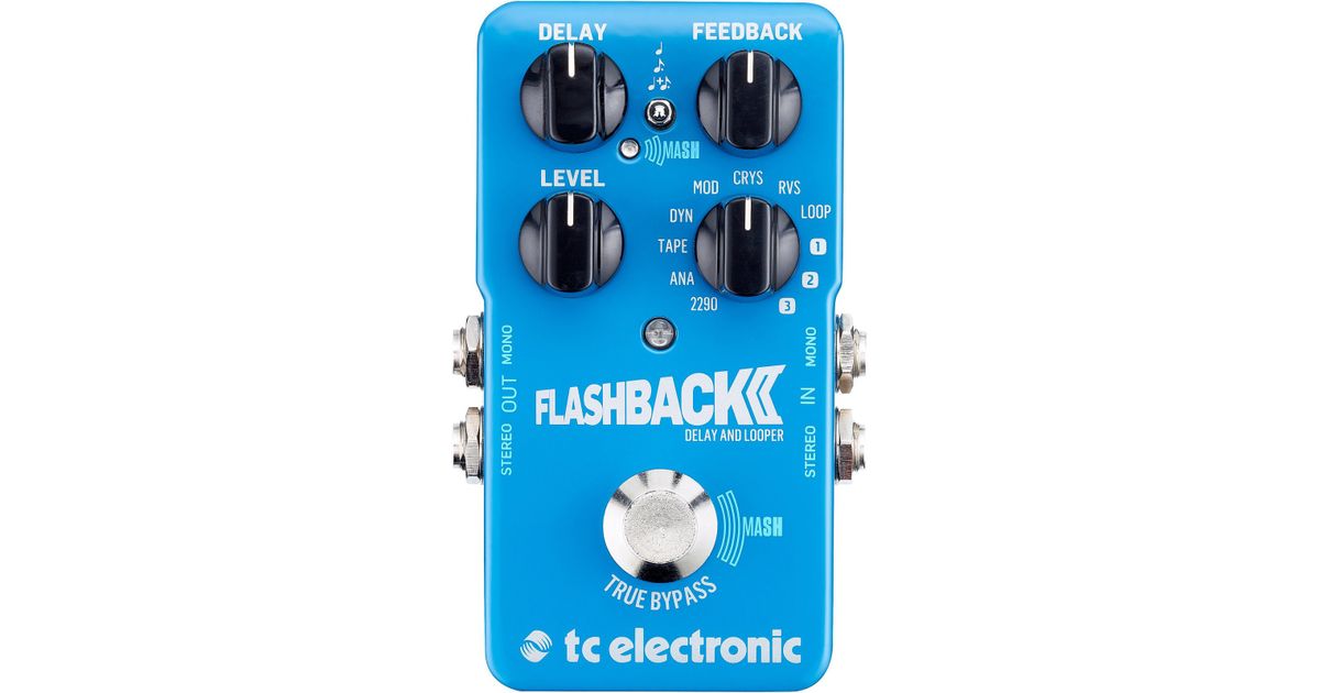 Delay and looping effects pedal for electric guitar that serves up a sonic buffet of expressive delay by infusing the pressure sensitive MASH technology with TC Electronic's renowned delay algorithms. The MASH technology reacts to the amount of pressure you put on the switch - the harder you press, the more intense the effect. It is controllable through the free TonePrint Editor which means that user can assign to any parameter and up to 3 parameters at once. For each delay preset, MASH will control a different parameter. The pedal features completely redeveloped Tape and Analog algorithms, which recreate the tones of old school echoes with unheard realism. It also offers a shimmering Crystal delay, made with TC's own polyphonic octave algorithm from Sub 'N' Up Octaver pedal. In total, it offers 8 high-quality delay types and 3 TonePrint slots, plus a 40 second looper. Sound can be adjusted by Delay Time, Level and Feedback controls. The pedal provides stereo in/out and true or buffered bypass.