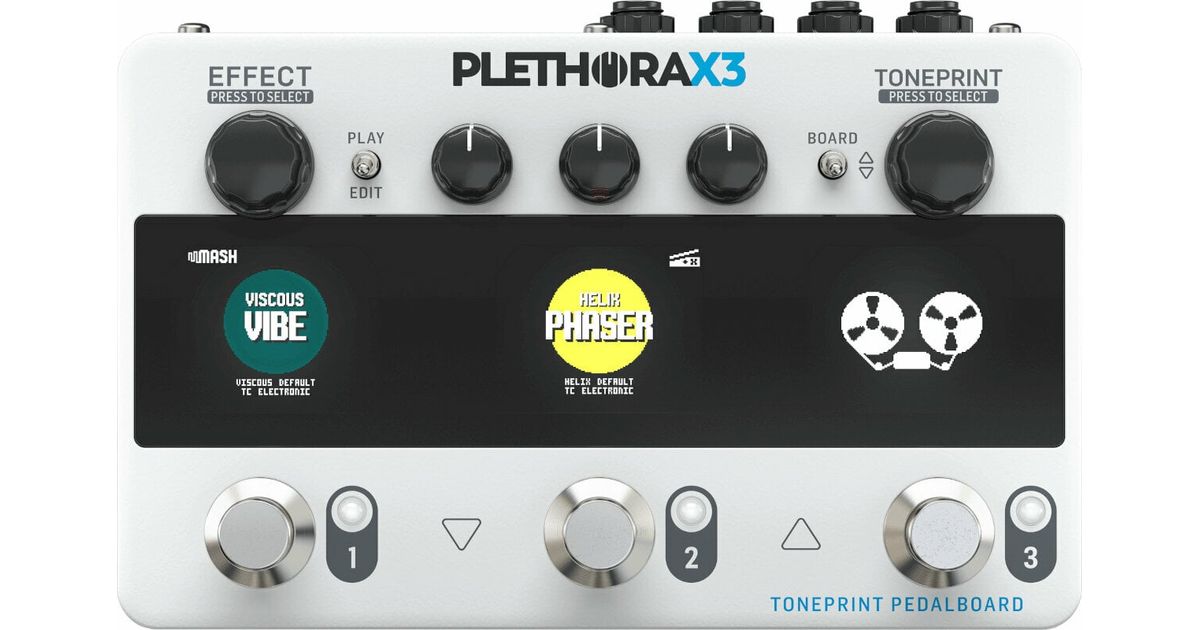 PLETHORA X3 is your flexible collection of up to 127 mini boards within your pedalboard – just like the original PLETHORA X5. In comparison, the only hint of a compromise is 3 slots instead of 5, but you may well find that beneficial, as it takes up less precious real estate on your pedalboard! Rest assured that the sound quality and flexibility is every bit as hard rocking as PLETHORA X5.Load any one of your favorite TC Electronic TonePrint effects in any one of the 3 pedal slots. Then add up to 75 custom, swift-recall TonePrints to each effect and you’re good to go. Once you have buckled up and got your fingers flying, step up and MASH the footswitches for mind-bending expressiveness. Each footswitch acts as an expression controller with customizable mapping. Tailor each effect and MASH-functionality to catch your drift and fit your playing style perfectly!