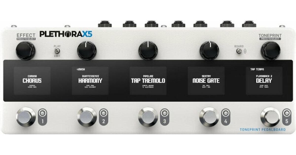 Want access to TC Electronic’s entire TonePrint library? The PLETHORA X5 gives it to you, plus a whole lot more, in a stereo multi-FX pedal that’s jam-packed with player-friendly features. The PLETHORA X5 stores a lot — a lot — of effects under its streamlined, easy-to-use layout. Not only do you get five FX slots, with up to 75 TonePrints in each slot, you can store up to 127 custom pedalboards using any combination of effects. MASH footswitches supply real-time expressive control over your effects, while an expression input enables you to take command of any effect or add a volume pedal anywhere in your signal chain. Beyond that, an FX loop with customizable routing allows you to integrate external stompboxes or connect to your amp using 4-cable method. The PLETHORA X5 includes all of the essential features you demand, such as a tuner, noise gate, cab sim, tap tempo, and MIDI connectivity. Complete with TonePrint App editor compatibility and Bluetooth connectivity, the TC Electronic PLETHORA X5 belongs at the heart of your guitar rig.
