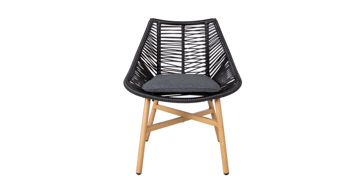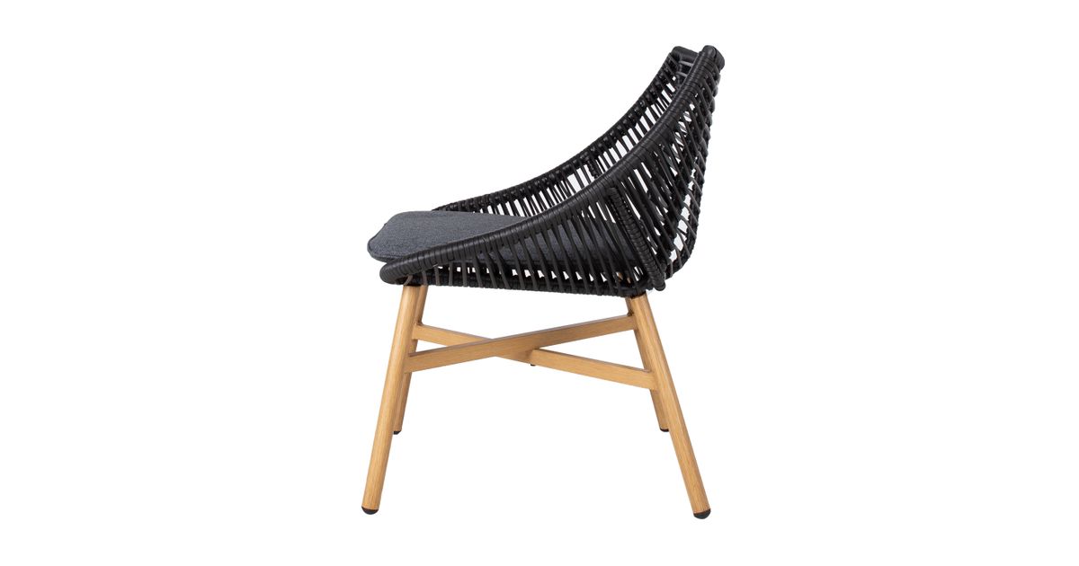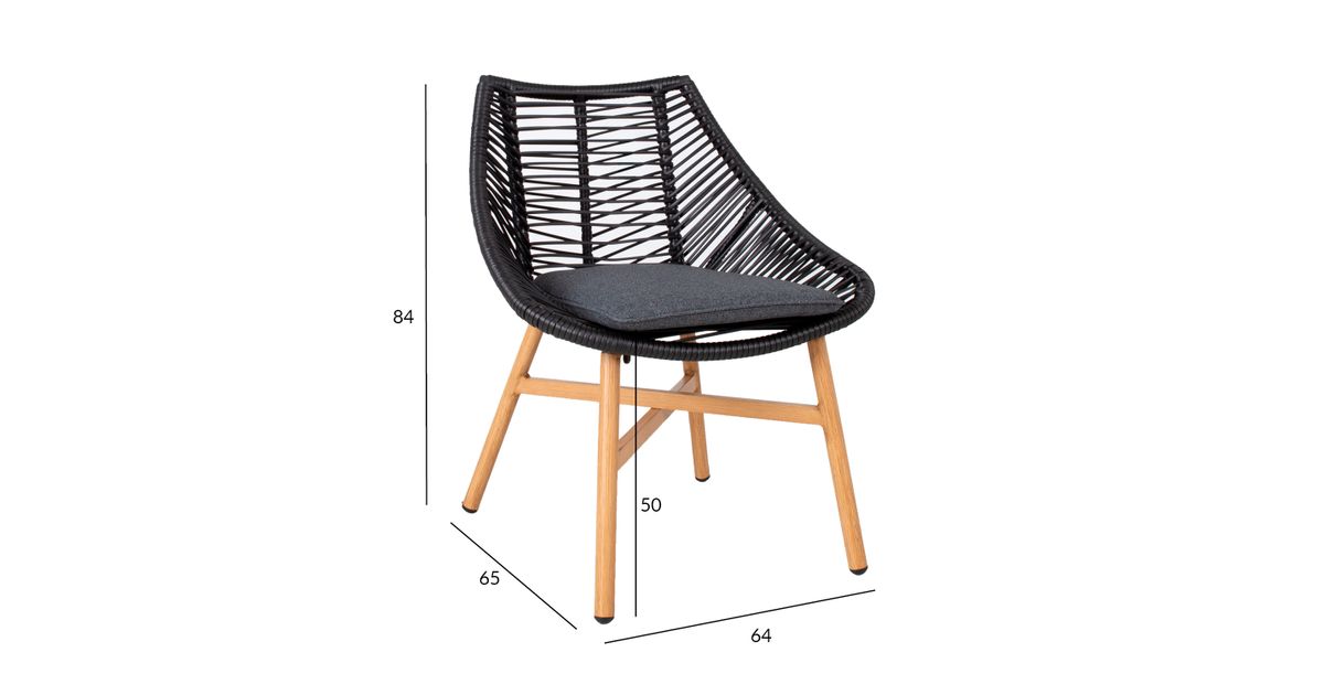 Tooli istmeosa on kaetud musta plastiknöörpunutisega, jalad ja alusraam on värvitud tiikpuu sarnaseks. Istmepadi kuulub komplekti. Padjakate: tumehall polüesterkangas.