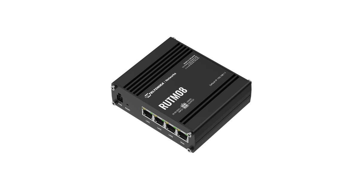 RUTM08 on tööstuslik juhtmega ruuter, mis on mõeldud usaldusväärsete kaabliühenduste loomiseks paljudes tööstuslikes rakendustes. Marsruuteril on neli Gigabit RJ45 porti, mis võimaldavad kiiret võrgu- ja andmeedastust ühendatud lõpp-punktide vahel. RUTM08 toetab kuni 128 tag/port-põhist VLANi, mis suurendavad võrgu paindlikkust, ning mitut VPN-i ja M2M-sideprotokolli, mis on eriti olulised tööstuskeskkondades.