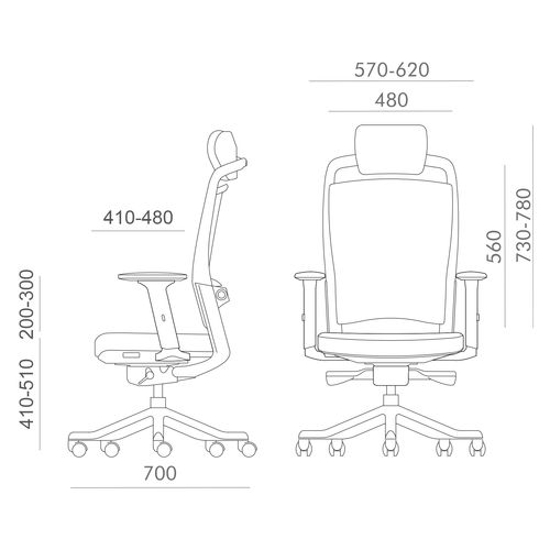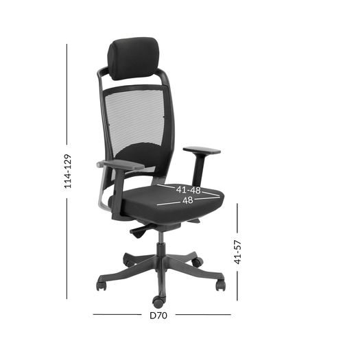 Istme kattematerjal: polüesterkangas, 50 000 Martindale’i. Seljatugi on kaetud polüestervõrkkangaga, mis tagab hea õhu liikuvuse. Raami värvus: must/hõbedane. Mehhanism ja seadistused: kaalutundlik sünkroonmehhanism korrigeerib kiike jäikuse automaatselt vastavalt istuja kaalule. Reguleeritav nimmetugi. Istme kõrgus reguleeritav gaasamordi abil. Mustad plastikust käetoed: kõrgus reguleeritav 20-30cm, sügavus ja pöördenurk reguleeritavad. Peatoe kõrgus reguleeritav. Must 5-haruline plastikrist D70cm, 50mm plastikrattad. Mõõtmed: kõrgus 114-129cm, istme kõrgus 41-57cm, istme sügavus 41-48cm, istme laius 48cm. Lisainfo: kaalupiirang 120kg.