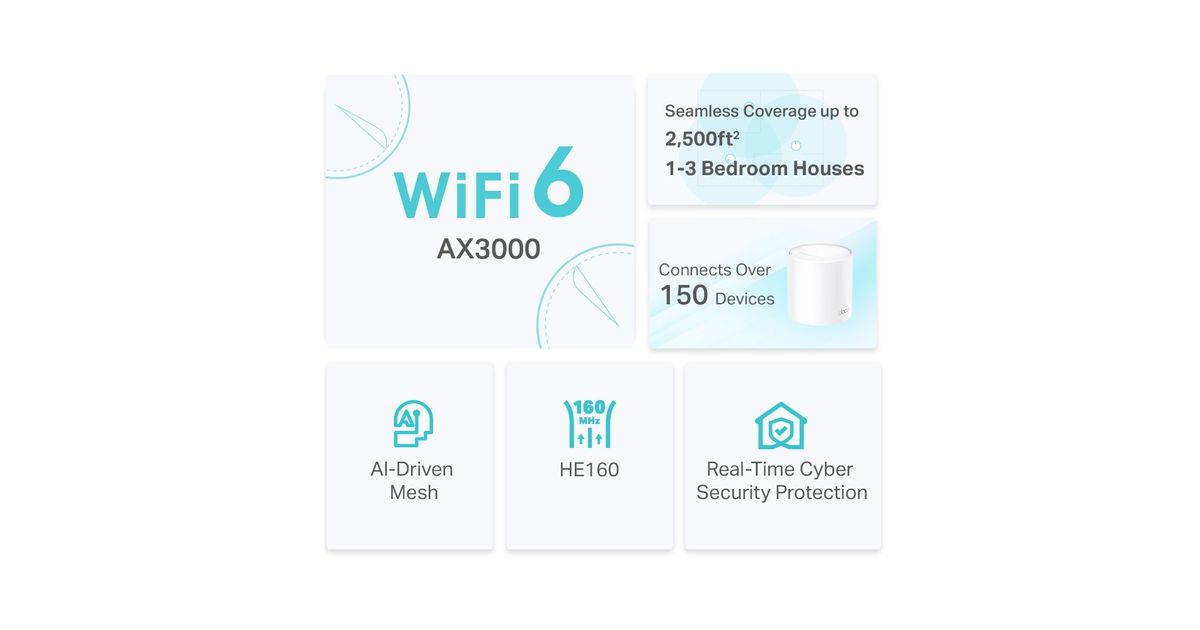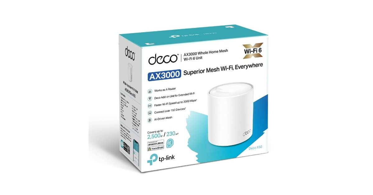 TP-Link Deco X50, Valge, Sisemodem, CE: <20 dBm (2.4 GHz) <23 dBm (5 GHz) FCC: <30 dBm (2.4 GHz) <30 dBm (5 GHz), 0 - 40 °C, -40 - 70 °C, 10 - 90 protsenti