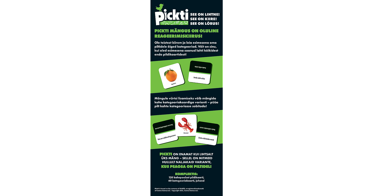 Kiire mäng milles peaosa on piltidel! Pickti mängus on oluline reageerimiskiirus! See on lihtne, see on kiire, see on lõbus! Ole teistest kiirem ja leia esimesena oma piltidele õiged kategooriad. Võit on sinu, kui oled esimesena saanud lahti kõikidest enda pildikaartidest! Mängule vürtsi lisamiseks võib mängida kahe kategooriakaardiga varianti – püüa pilt kahte kategooriasse sobitada! Pickti on enamat kui lihtsalt üks mäng – sellel on mitmeid hullult naljakaid variante, kus peaosa on piltidel! Sobib vanusele: 6+. Mängijaid: 1–10. Mäng kestab: 20-35 min.
