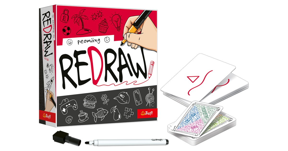 REDRAW on ainulaadne peomäng, kus ei pea oskama joonistada, et kunstnik olla. Peate vaid täiendama ja kaunistama seda, mida teised mängijad on loonud. Teised mängijad proovivad ära arvata, millist parooli parasjagu joonistatakse. Kes paneb esimesena käe õigele kaardile, saab kaardi endale punktiks. Esimene mängija, kes kogub viis kaarti, võidab! Sobib vanusele: 10+. Mängijaid: 2–8. Mäng kestab: 15–20 min.