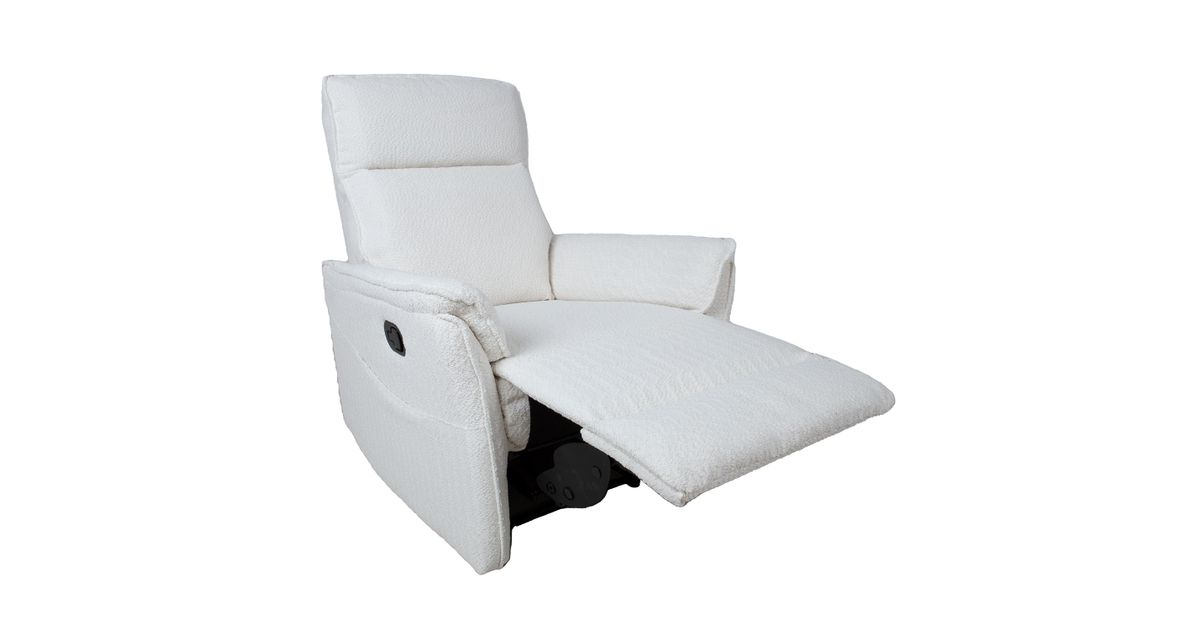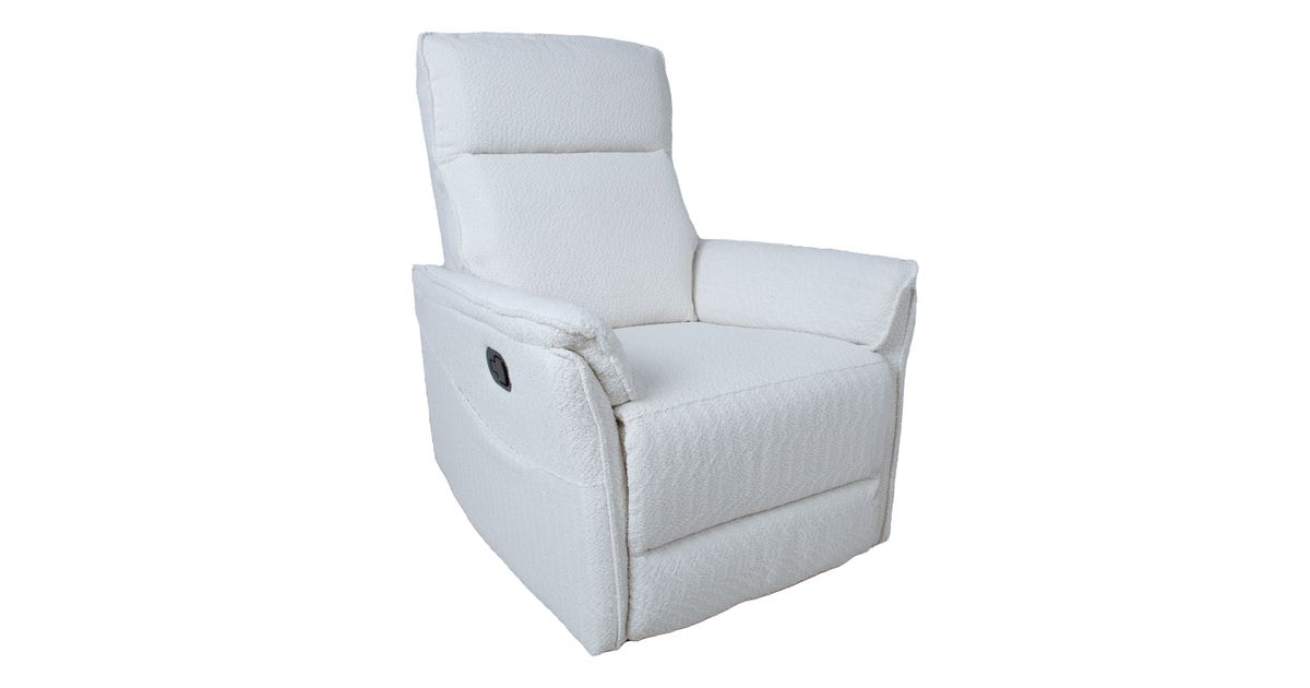 Tugitool GERRY manuaalne recliner 76x92xH101cm, valge. Recliner tüüpi tugitooli selja- ja jalatoe asendit on võimalik muuta manuaalse mehhanismi abil. Jalatuge üles tõstes liigub seljatugi sujuvalt kaasa lamavasse asendisse. Kattematerjal: 100% polüesterkangas, Martindale 15 000. Karkass ja vedrustus: vineer, pocket vedrud. Polsterdus: polüuretaanvaht, polüesterkiud.