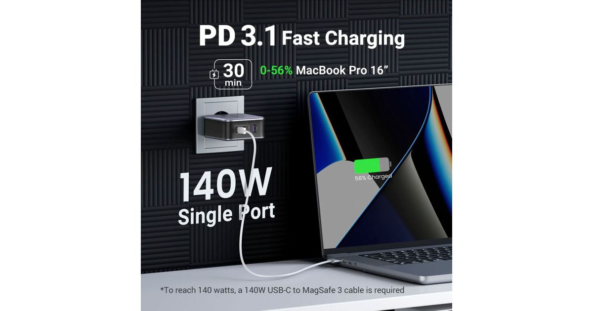 - With only the USB-C1 port used, PD 3.1 boosts charging power to 140W. Charge the MacBook Pro 16'' to 56% in 30 mins, 1.8 times faster than a 65W USB-C laptop charger.