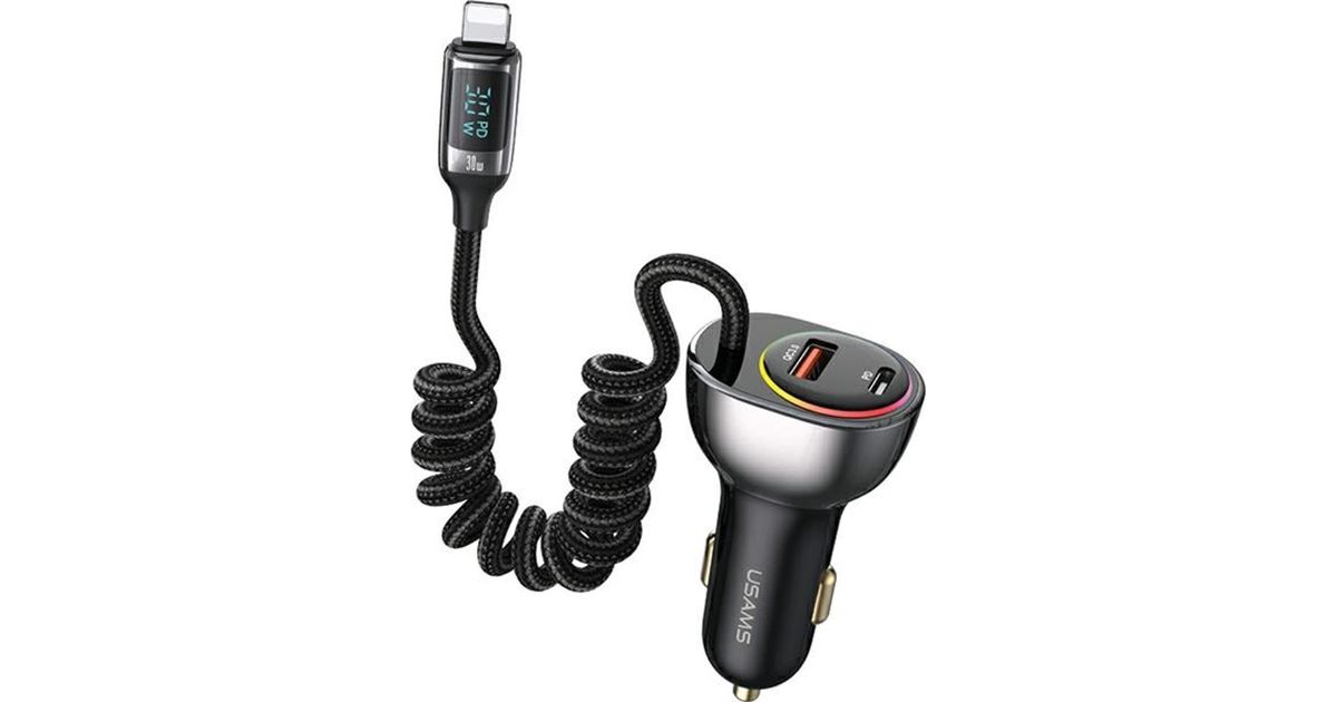 Usamsi laadija USAMS autolaadija US-CC193 1xUSB-A 18W+1xUSB-C 30W + süütekaabel 30W PD+QC kiirlaadimine must/must