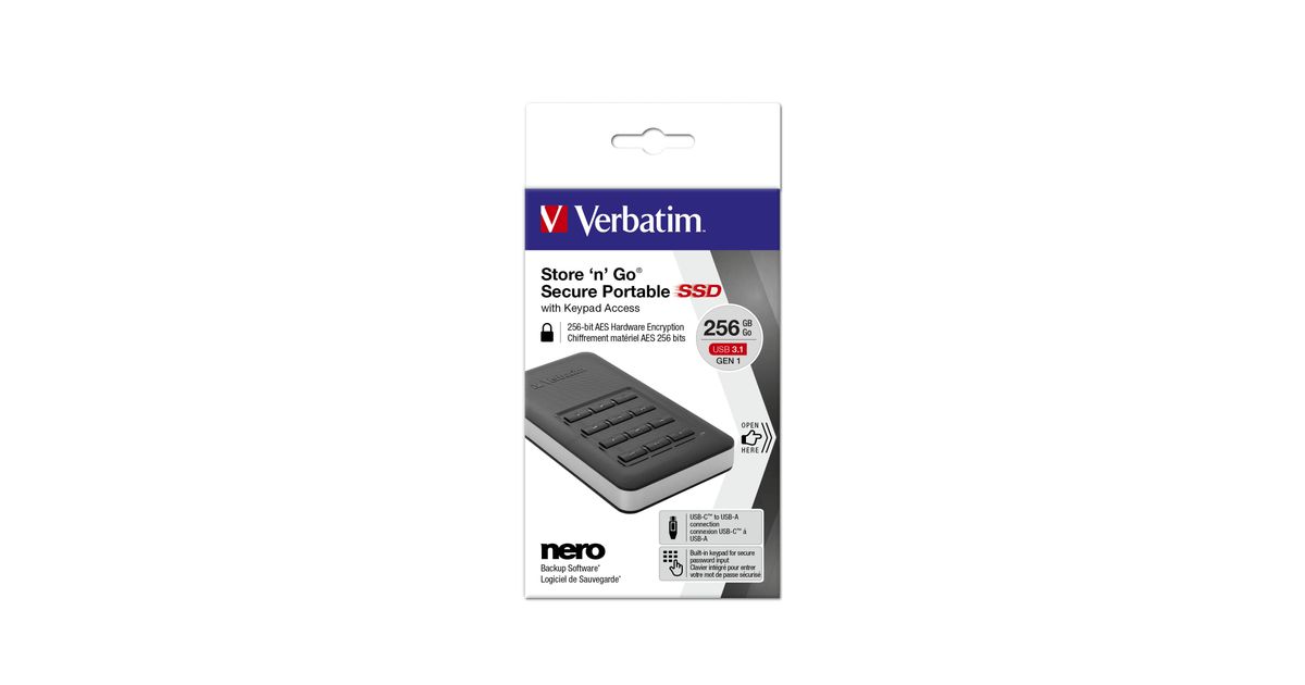 Verbatim Store'n'Go, 256 GB, USB tüüp-C, 3.2 Gen 1 (3.1 Gen 1), Salasõna kaitse, Must, Hõbe