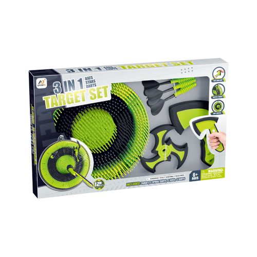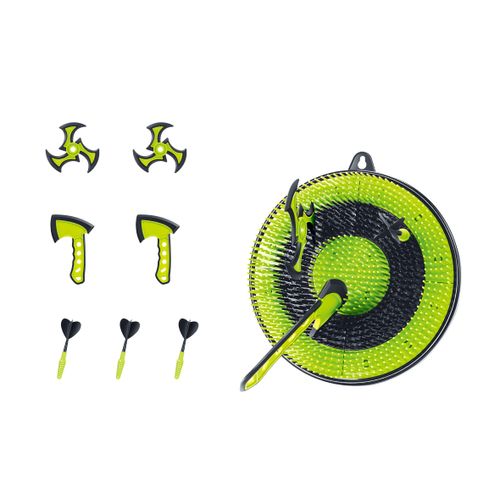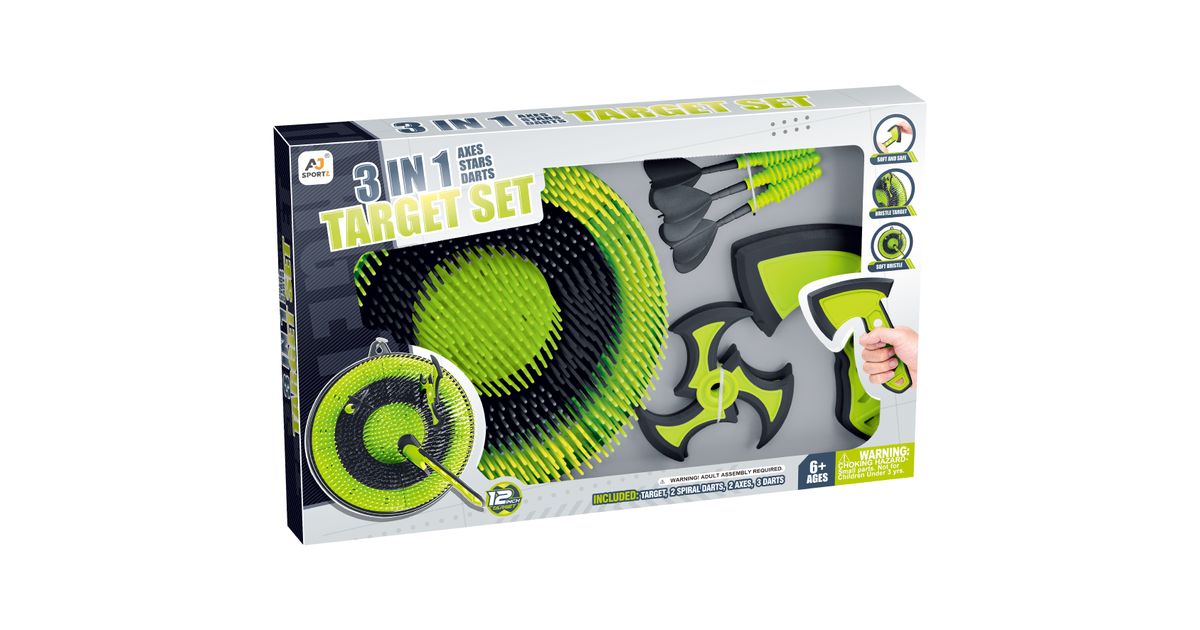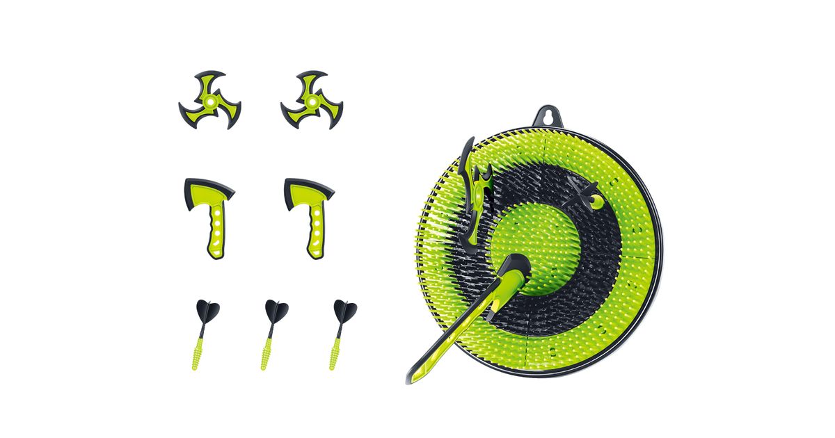 See mitmekülgne komplekt sisaldab 30 cm sihtmärki, 2 kirvest, 2 spiraalnoolt ja 3 klassikalist noolt. Need nooled sobivad ideaalselt igale vanusele ja nendega on lõbus mängida nii kodus kui ka õues. See on koguni kolm erinevat ja põnevat mängu ühes! Sihi, viska ja võistle sõpradega, et näha, kelle käsi on parim!