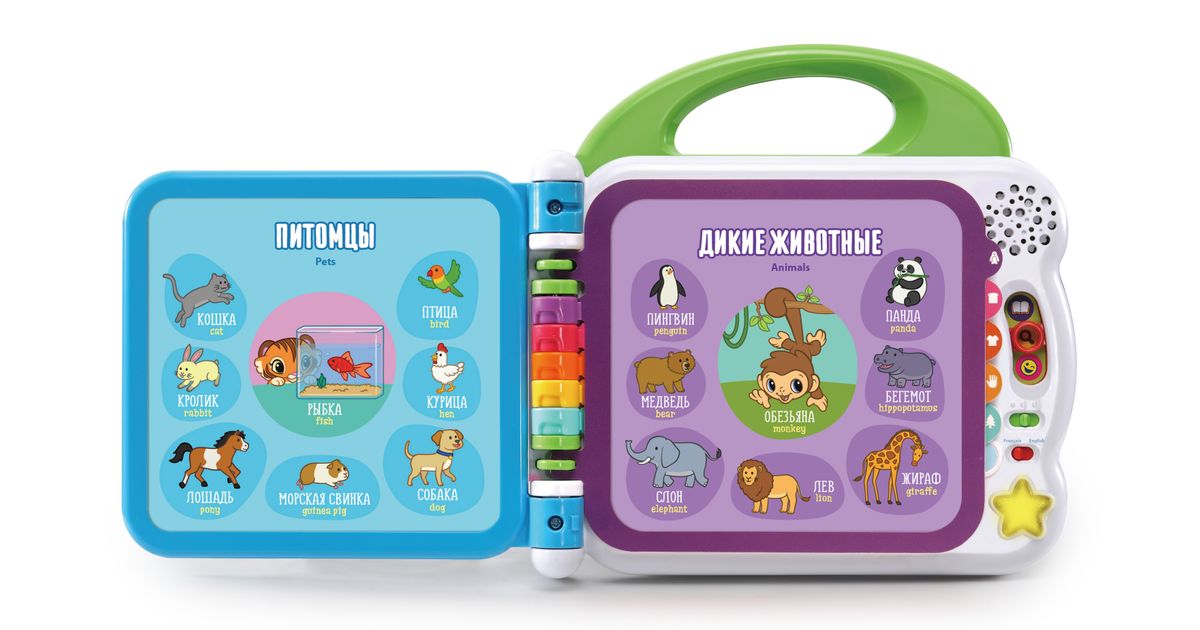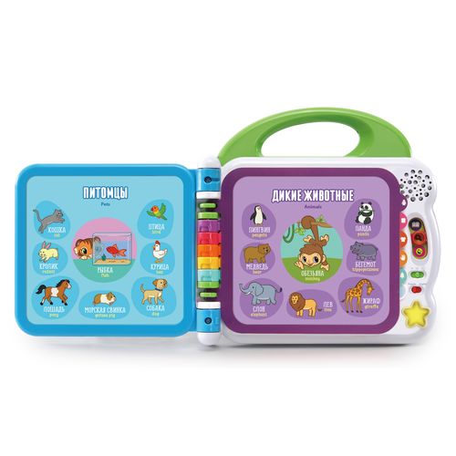 Interaktiivne raamat on lahe ja lõbus õppemänguasja, mis õpetab teie lapsele värve, loomi, puuvilju, sõidukeid ja palju muud. Raamatus on koguni 100 sõna inglise/vene keeles, palju erksavärvilisi pilte ja lõbusaid laule. Piltide puudutamisega õpib laps sõnu, väljendeid ja nendega seotud helisid. Raamatul on reguleeritav helitase ja 3 mängurežiimi: sõnavara, uute asjade õppimine ja lõbusad helid.
