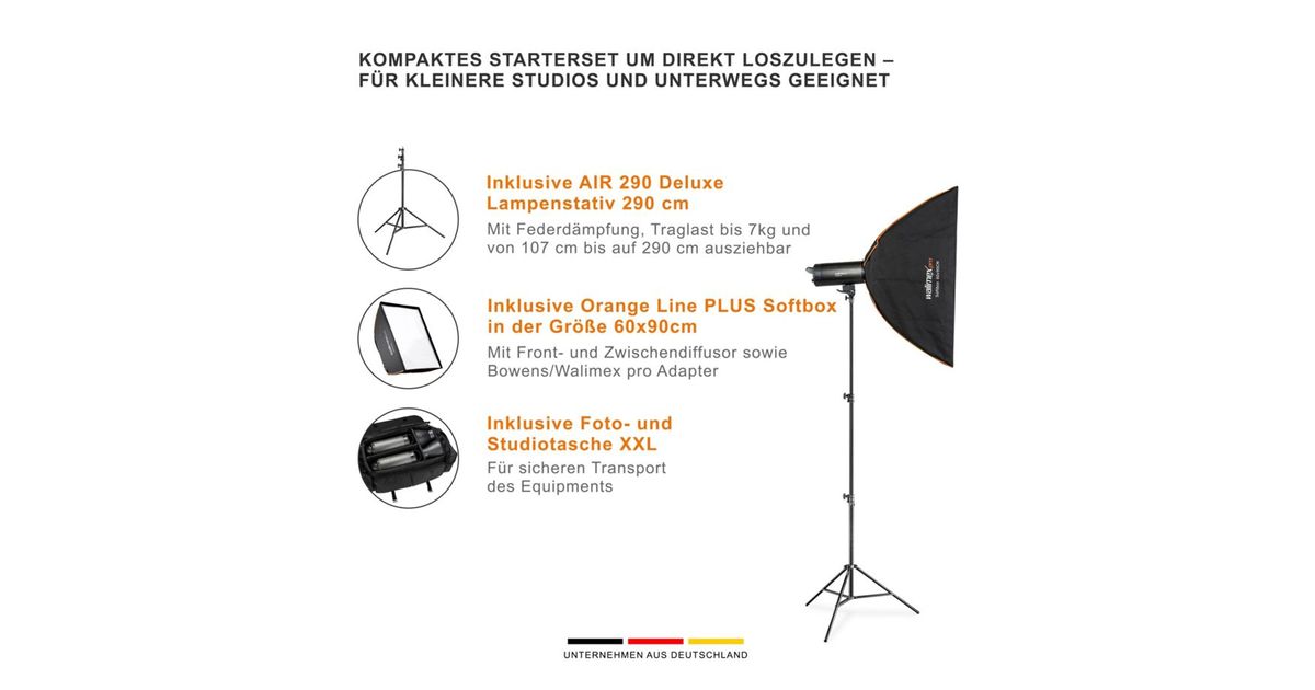 Including 2x walimex pro AIR 290 Deluxe Lamp Tripods 290cm with air suspension (max. load 7kg). These can be extended from 107cm up to 290cm. Furthermore, the set contains 2x walimex pro Orange Line PLUS soft boxes (60x90cm) with front and rear diffuser, grids as well as a Bowens/walimex pro Adapter. Furthermore, a walimex pro photo and studio bag XXL is included in the set for a safe transport of the equipment.