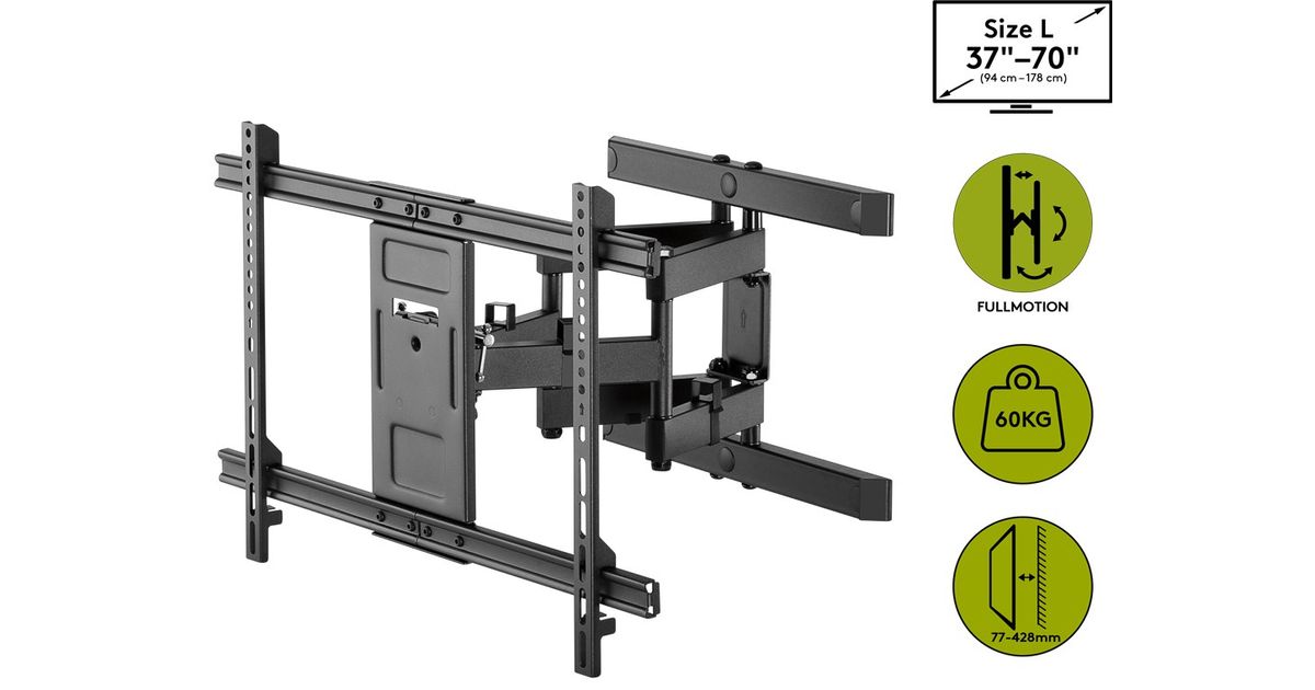 The Full Motion mount for most 37 to 70 inches (94-178 cm) TV up to 60 kg.The bracket provides optimal tilt angle by a wall distance of up to 428mm. Full Motion allows maximum flexibility. You can tilt, pan, spread out and leveled to look at your TV from any seat in the room. All this without tools. The leveling after installation ensures that the TV is perfectly positioned on the wall. The integrated cable management system organizes and protects the cable.
