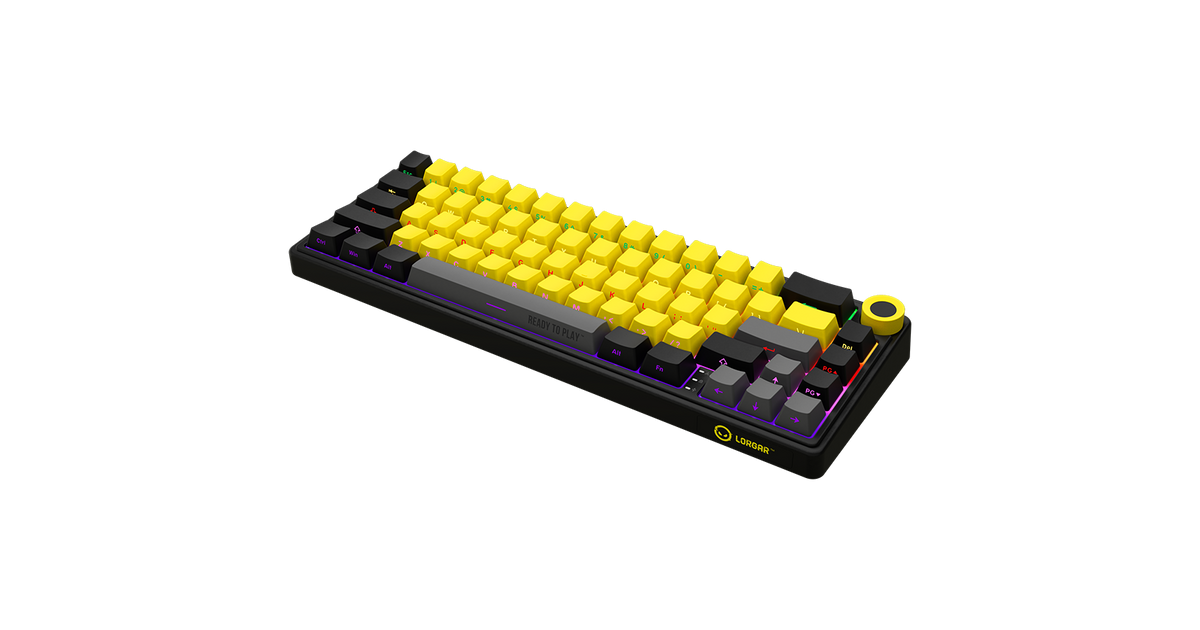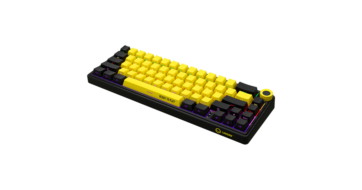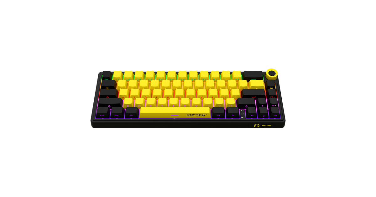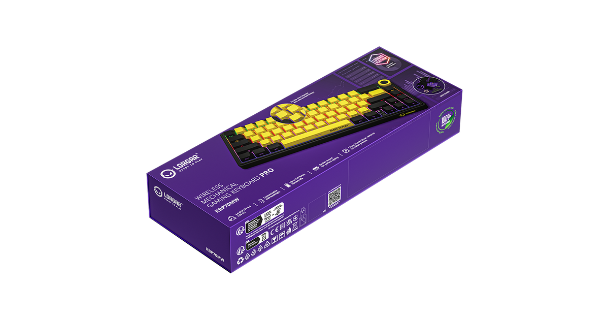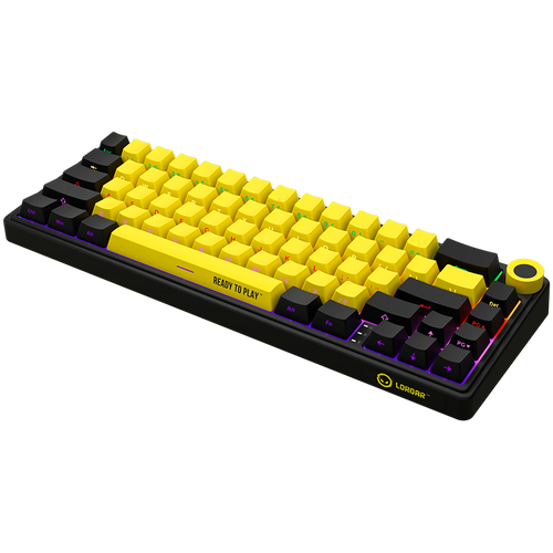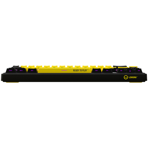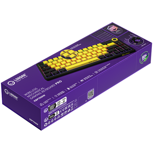 Wireless mechanical gaming keyboard Pro, 2.4 GHz, BT, RGB Backlight, 16 modes, 66 keys, 50M presses, linear Lorgar Toxic Purple switches, multimedia knob, built-in 3750 mAh battery, Hot Swap, Gasket mount, spring cable 2.3m, black yellow