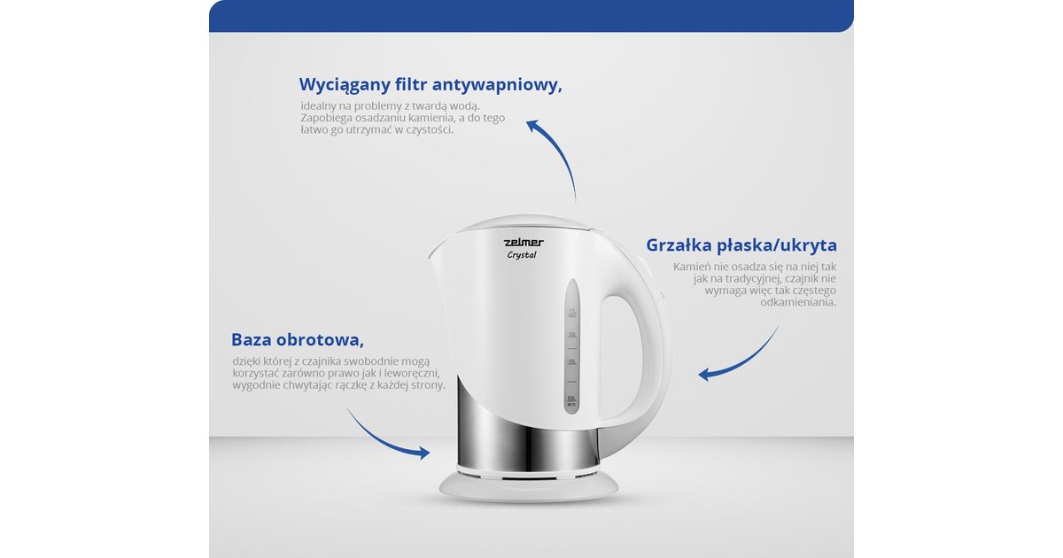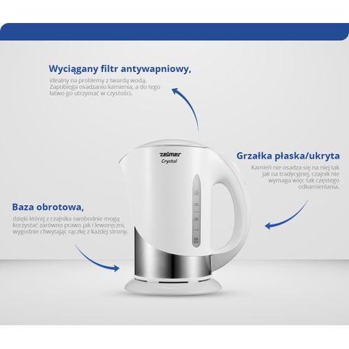 Zelmer ZCK7630W, 1,7 l, 1850 W, Hõbe, Valge, Plast, Veetaseme indikaator, Filtreerimine