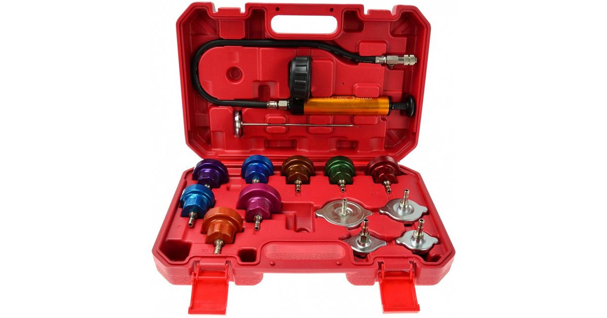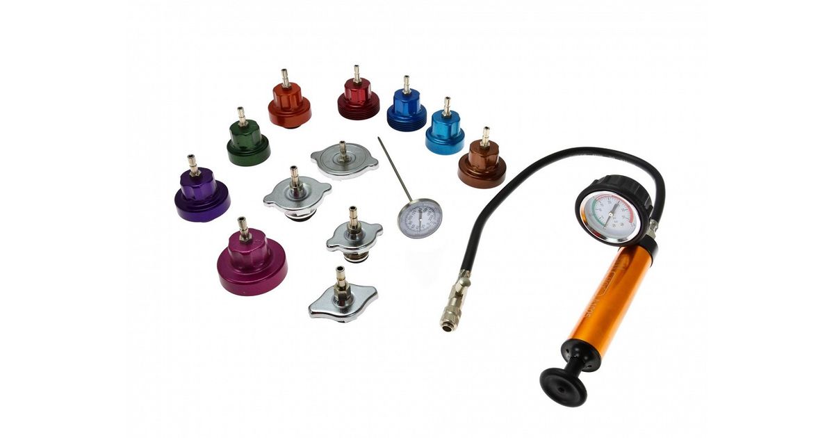 Universaalne komplekt testimaks enamike sõiduautode jahutussüsteemide survepidavust. vana jahutusvedeliku süsteemist täielikuks väljastamiseks ja ka õhukorkide eemaldamiseks süsteemist. Komplektis käsipump manomeetriga 0-2.5 bar. Adapterid enamikele Euroopa. Jaapani. Korea ja ka mõningate Ameerika autode jahutussüsteemidele. Komplektis sisalduv universaalne temperatuuriandur 0-200ºC võimaldab teostada testimist määratud temperatuuride juures.