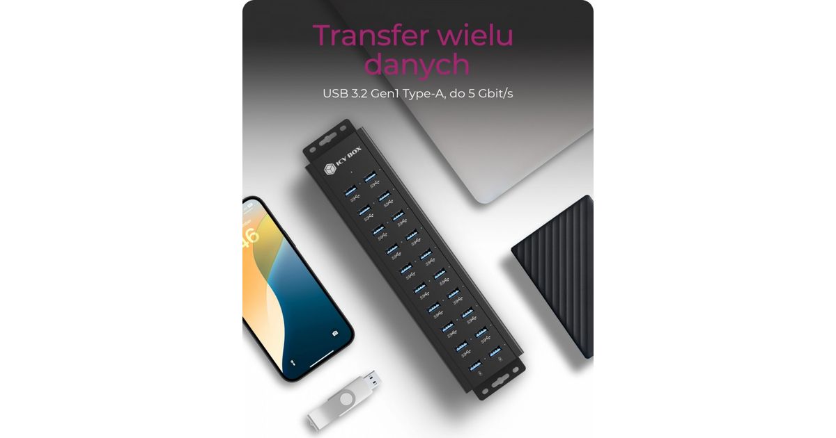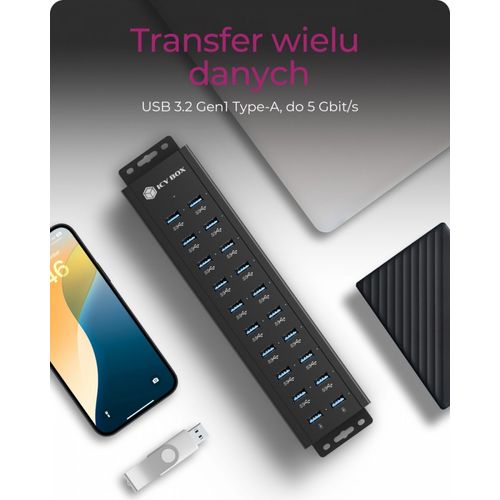 18+2 port USB Hub, 18x USB-A Daten Port, 2x USB Ladeport, USB 3.2 Gen 1 @ 5 Gbit/s, Befestigungsbohrung, 96W Netzteil, schwarz (IB-HUB1720-U3)