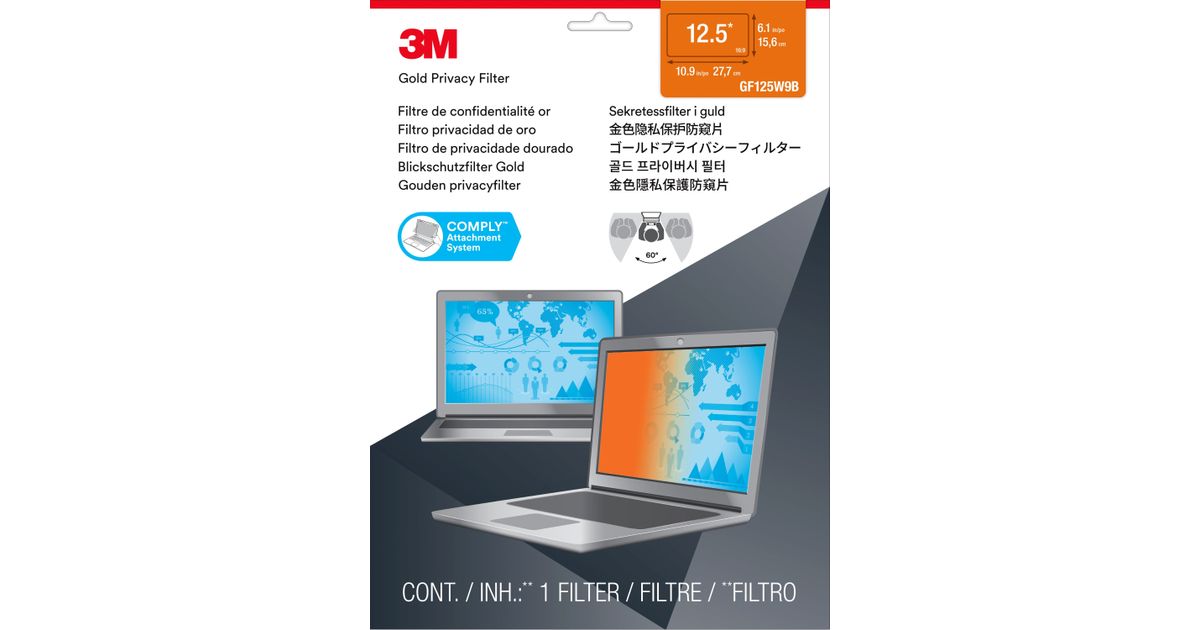 3M Kullanvärinen Tietoturvasuoja kannettavien tietokoneiden 12,5-tuumaisiin laajanäyttöihin, 31,8 cm (12.5"), 16:9, Kannettava tietokone, Kehyksetön näytön yksityisyyssuodatin