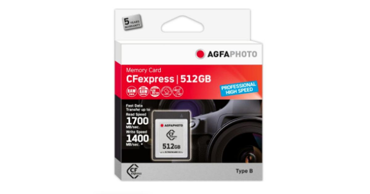 AgfaPhoto CFexpress Professional, 512 GB, CFexpress, NAND, 1700 MB/s, 1400 MB/s, Kylmänkestävä, Lämmönkestävä, Iskunkestävä, Röntgensäteenkestävä