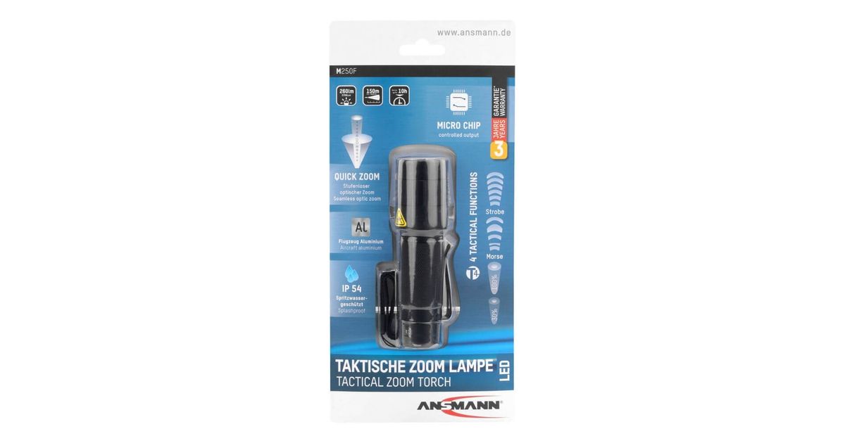 Ansmann M250F, Käsikokoinen taskulamppu, Musta, Painikkeet, Rotaatio, 1 m, IP54, 1 lamppua