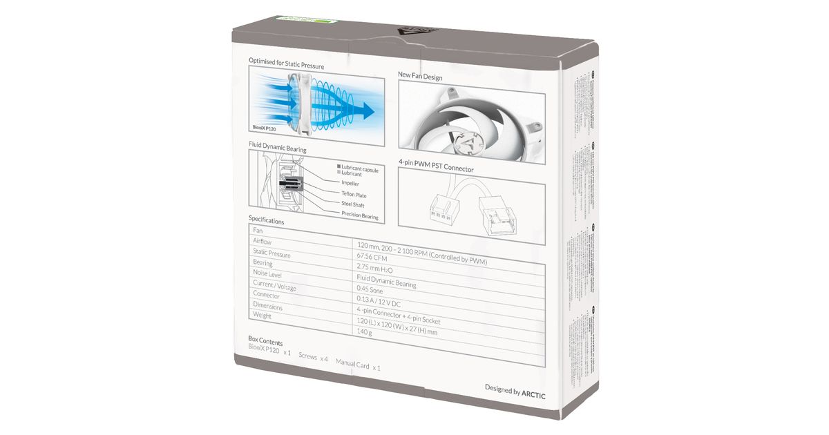 ARCTIC BioniX P120, Tuuletin, 12 cm, 2100 RPM, 0,45 soni, 67,56 cfm, 114,79 m³/h