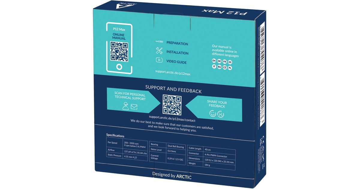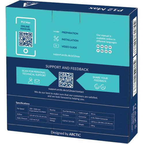 ARCTIC P12 Max, Tuuletin, 12 cm, 3300 RPM, 0,6 soni, 81,04 cfm, 137,69 m³/h