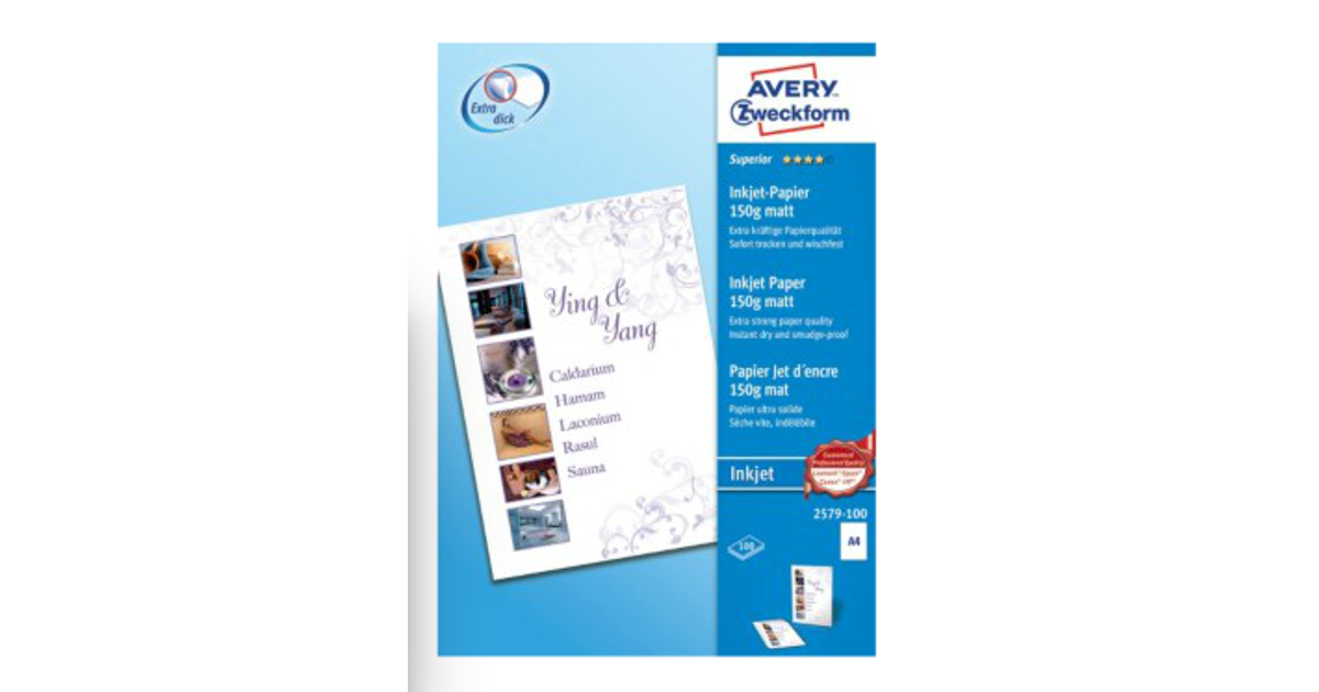 Avery 2579-100, Mustesuihku, A4, Valkoinen, 100 arkkia, Canon, Epson, HP, Lexmark standard inkjet printers, 210 mm