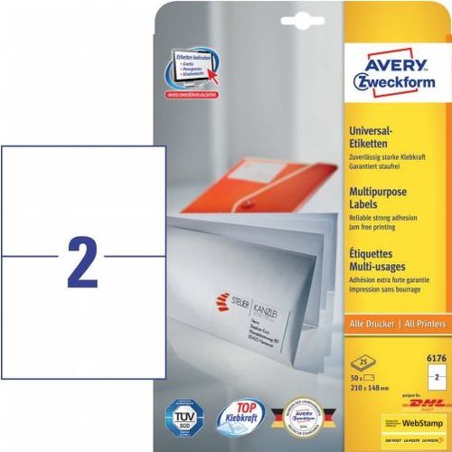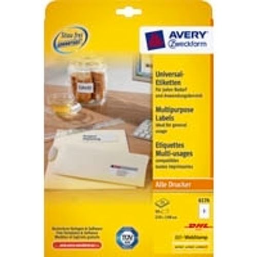 Avery 6176, Valkoinen, Suorakulmio, Kiinteä, A4, Paperi, Laser/Inkjet