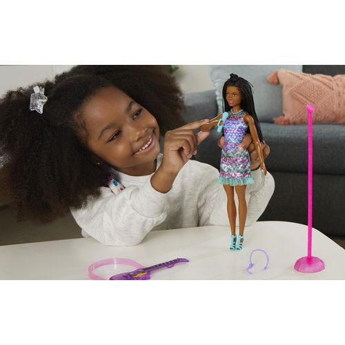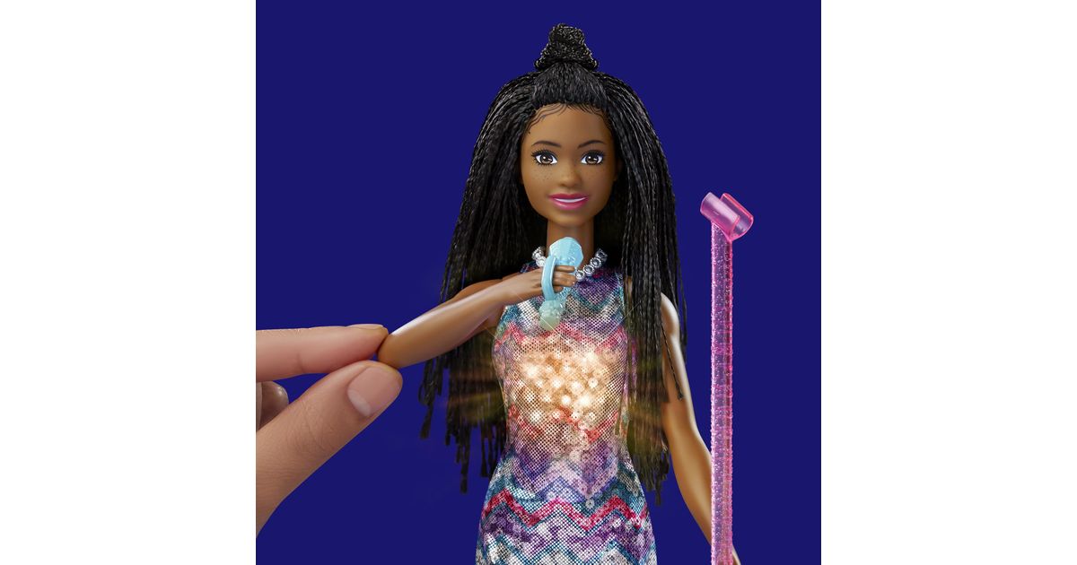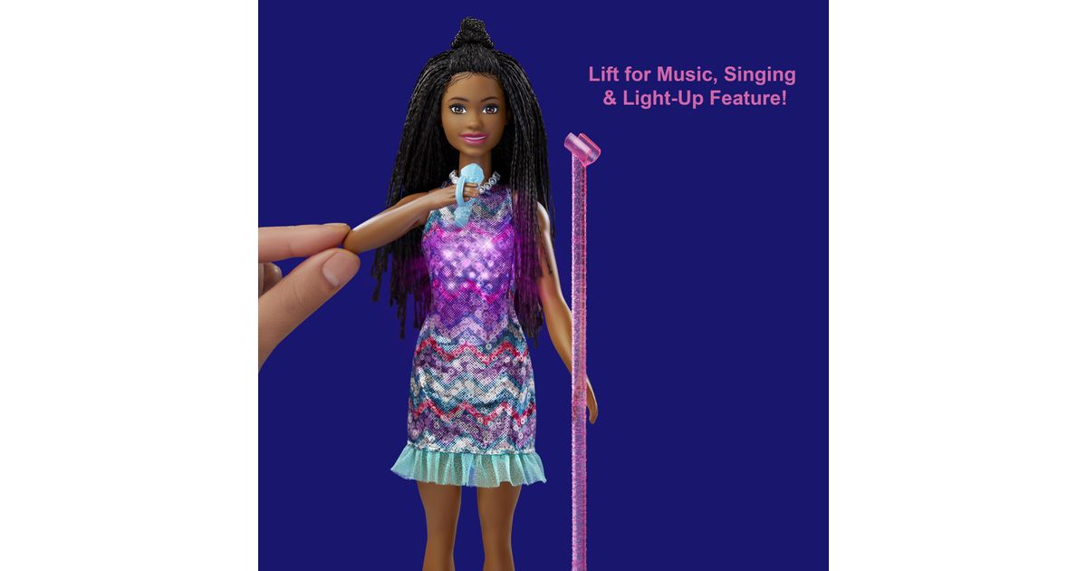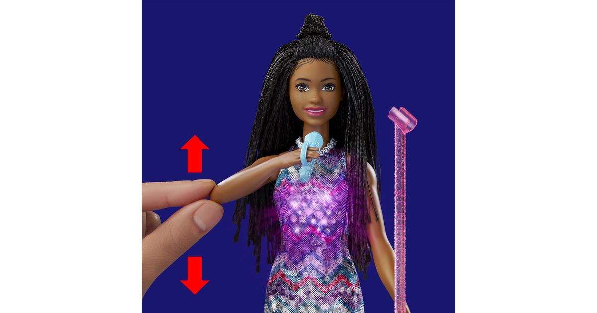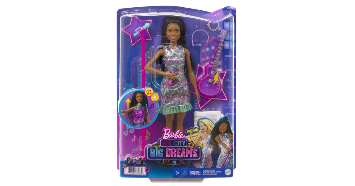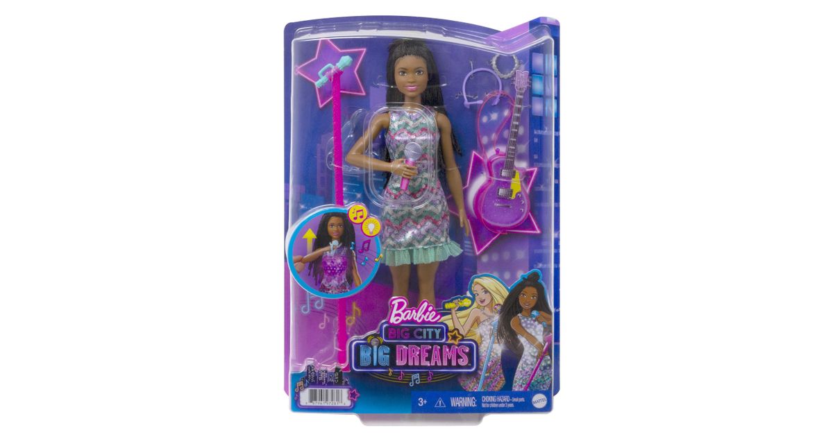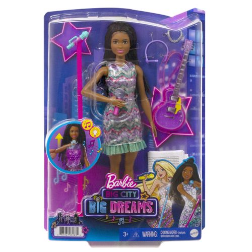 Koe huikeita hetkiä keikkalavalla Brooklyn-Barbie-nuken kanssa – nukke on pukeutunut Barbie: Big City, Big Dreams -elokuvasta tuttuun esiintymisasuunsa! Kun nostat mikrofonin Barbie-nuken suun eteen, musiikki alkaa soida, mekkoon syttyy valot ja nukke ”laulaa” kahta elokuvassa kuultua laulua! Kun lasket käsivarren takaisin alas, musiikki jatkuu, mutta Barbie lopettaa ”laulamisen”, kunnes nostat mikrofonin uudelleen. Yli 3-vuotiaat voivat ottaa duettoon mukaan myös Malibu-Barbie-nuken – kahdelle nukelle on kahta hauskempaa keksiä uusia seikkailuja! Nukke ei pysy pystyssä ilman tukea. Värit ja kuviot saattavat vaihdella.