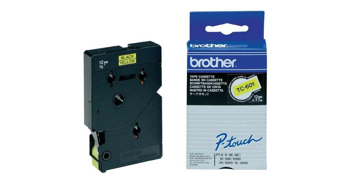 Brother TC-601, Musta keltaisella, TC, Brother, P-touch PT2000, PT3000, PT500, PT5000, PT8E, 1,2 cm, 7,7 m