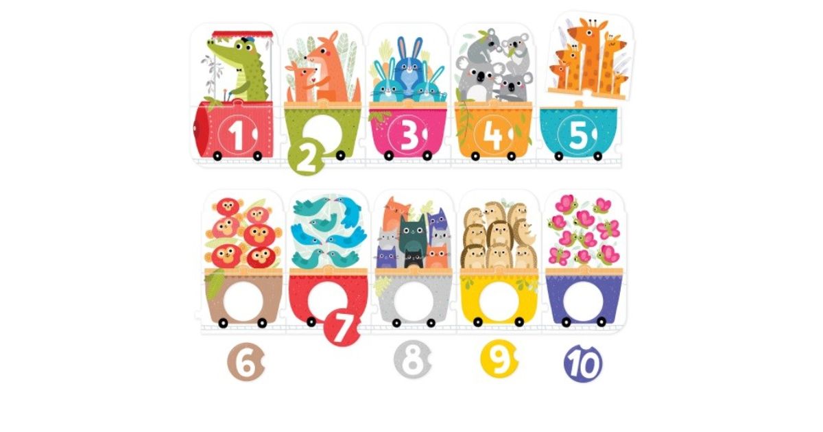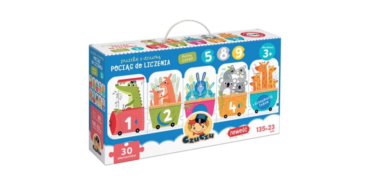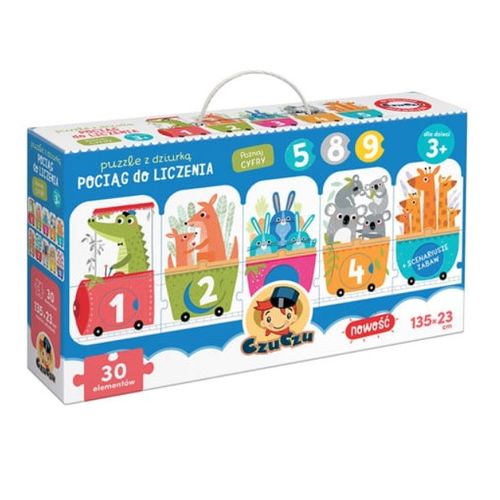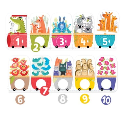 1 2 3 Time for a number journey! This educational panoramic puzzle features a long train and its passengers. It consists of 30 elements: 20 traditional puzzles and 10 removable circles with numbers to be matched with the appropriate holes. It's a great idea for creative play and learning to count up to 10.