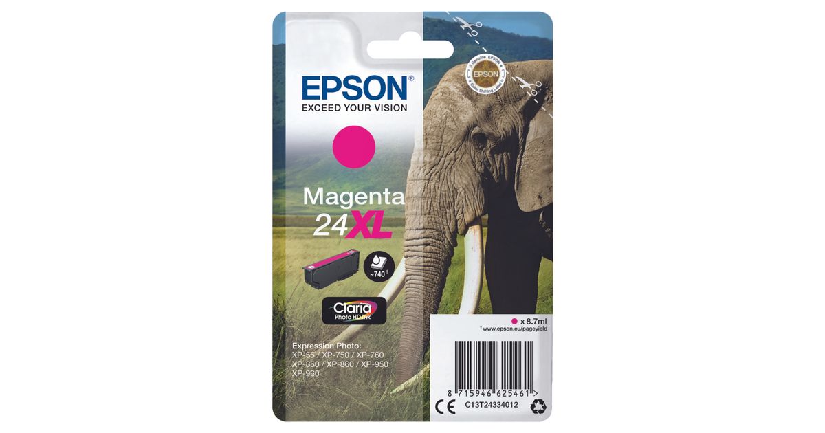 Epson Elephant Yksittäispakkaus, magenta 24XL Claria Photo HD -muste, Korkea (XL) värintuotto, Väriainepohjainen muste, 8,7 ml, 740 sivua, 1 kpl