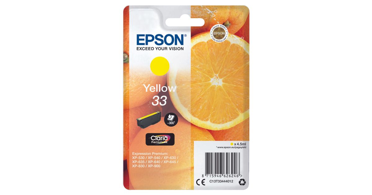 Epson Oranges Singlepack Yellow 33 Claria Premium Ink, Perusvärintuotto, Väriainepohjainen muste, 4,5 ml, 300 sivua, 1 kpl
