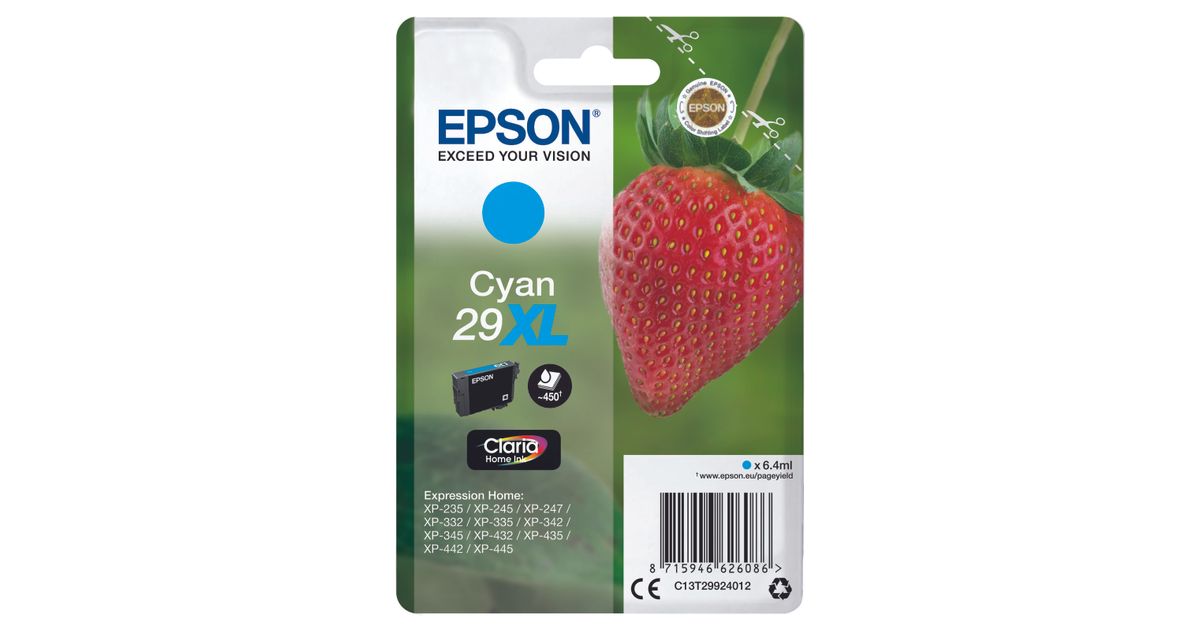 Epson Strawberry Singlepack Cyan 29XL Claria Home Ink, Korkea (XL) värintuotto, 6,4 ml, 450 sivua, 1 kpl
