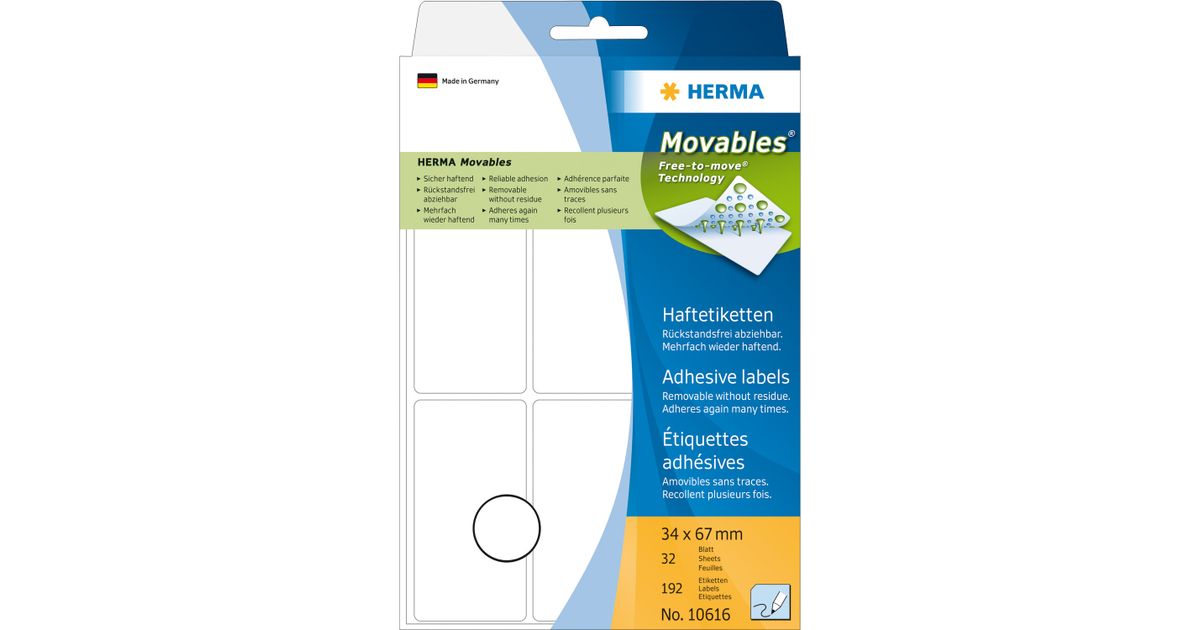 HERMA 10616, Valkoinen, Pyöristetty suorakulmio, Paperi, Saksa, 34 mm, 67 mm