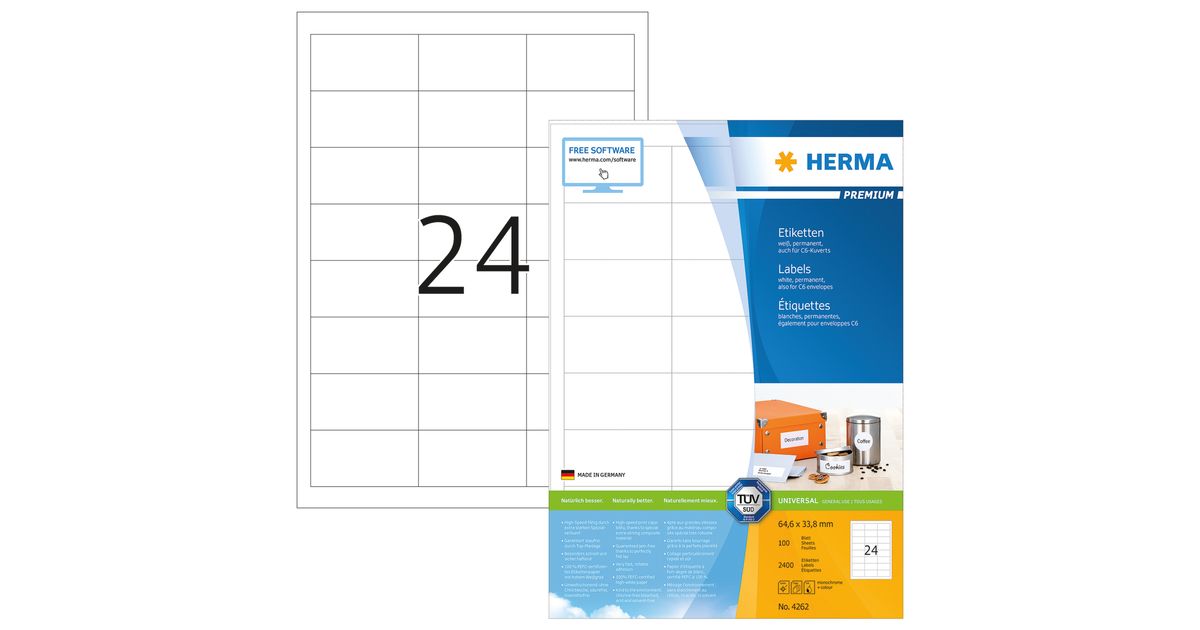 HERMA 4262, Valkoinen, Itse kiinnittyvä tulostintarra, A4, Paperi, Laser/Inkjet, Kiinteä
