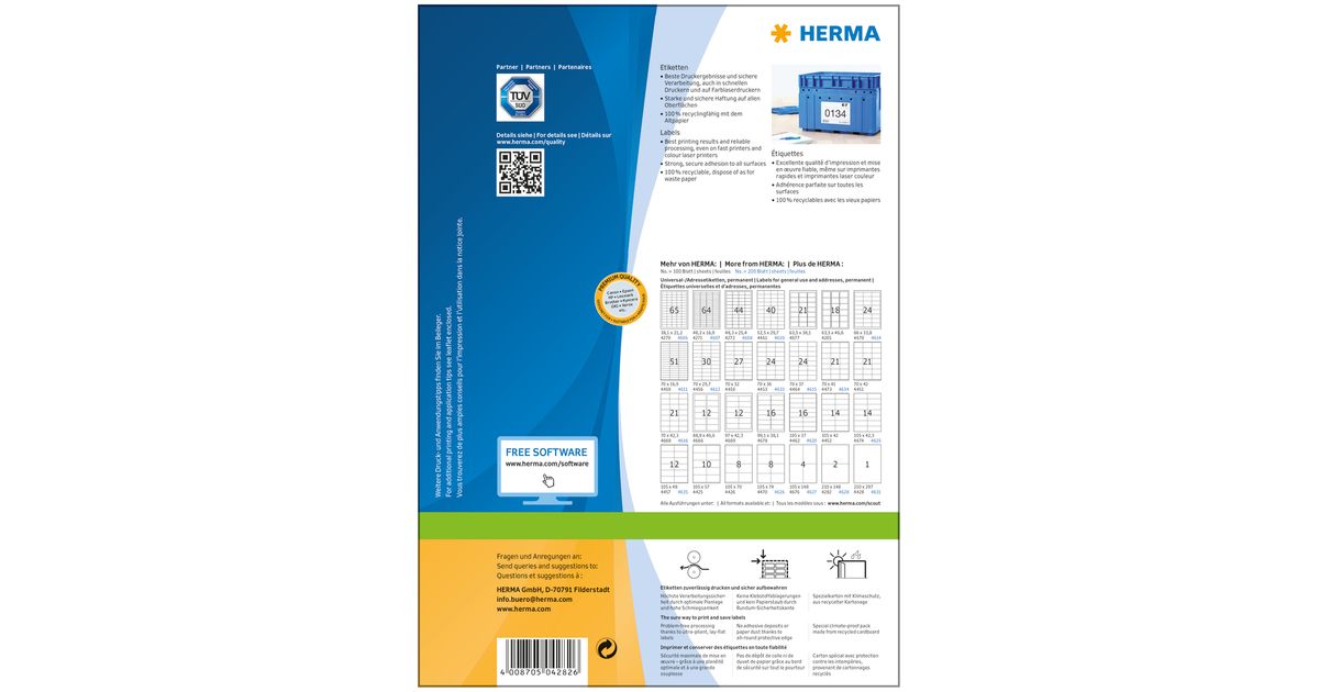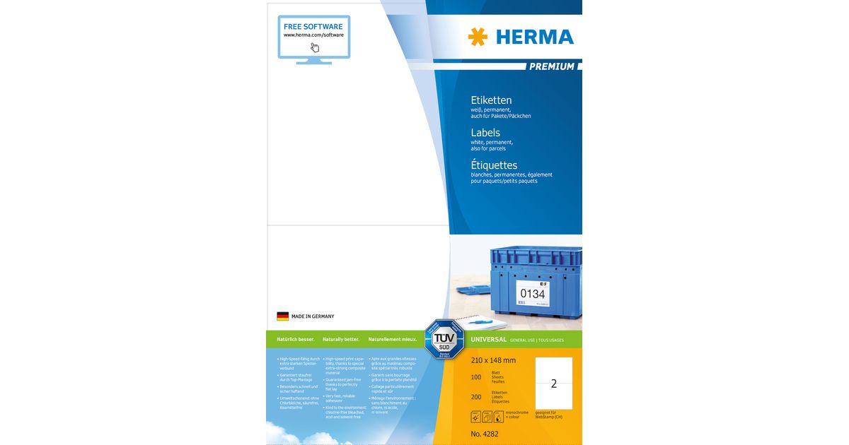 HERMA 4282, Valkoinen, Itse kiinnittyvä tulostintarra, A4, Paperi, Laser/Inkjet, Kiinteä