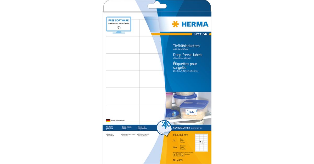 HERMA 4389, Valkoinen, Itse kiinnittyvä tulostintarra, A4, Paperi, Laser/Inkjet, Kiinteä