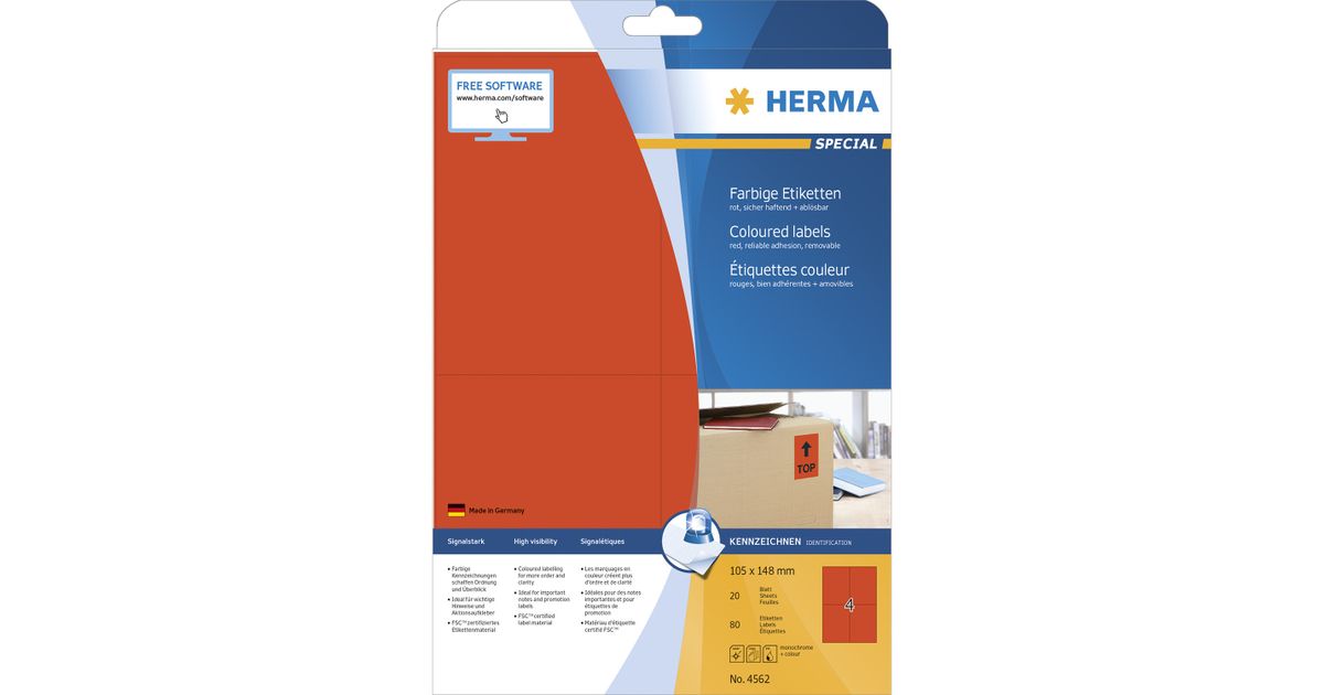 HERMA 4562, Punainen, Suorakulmio, A4, Universaali, Matta, Laser/Inkjet