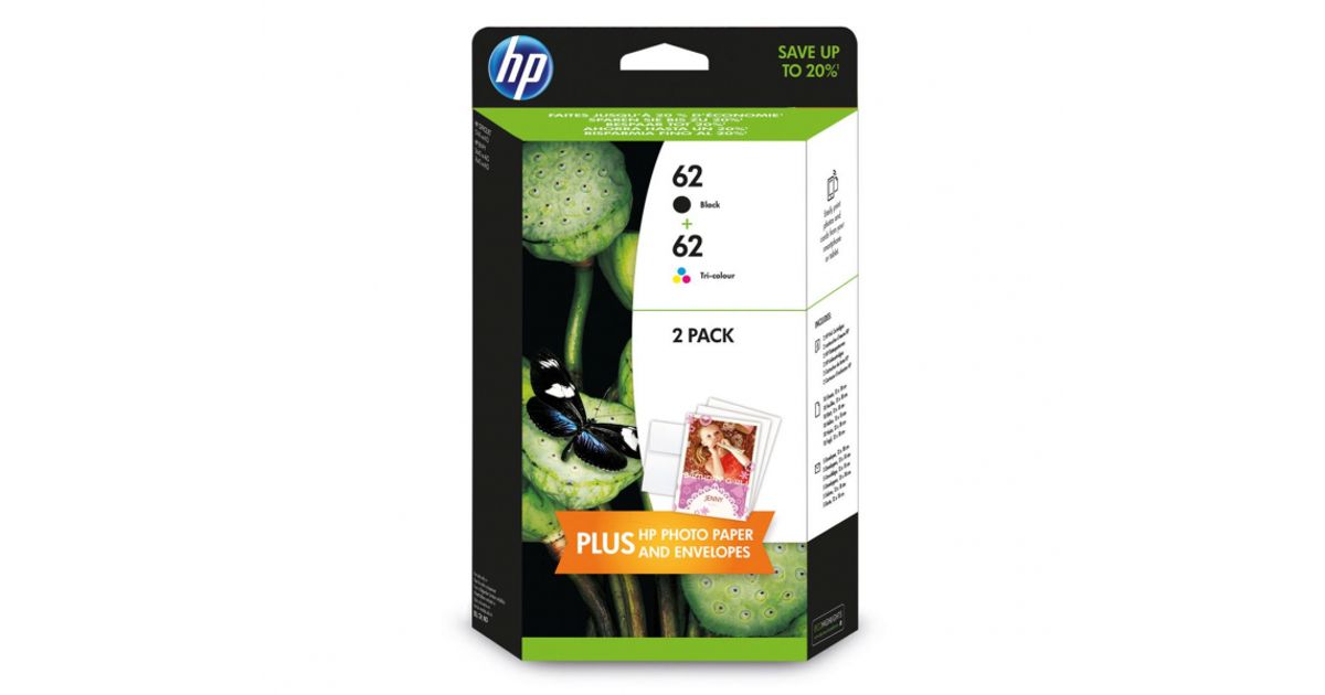 HP 62, alkuperäinen musta ja kolmivärinen mustekasetti, kaksoispakkaus, Perusvärintuotto, Väriainepohjainen muste, Väripohjainen muste, 200 sivua, 2 kpl, Monipakkaus