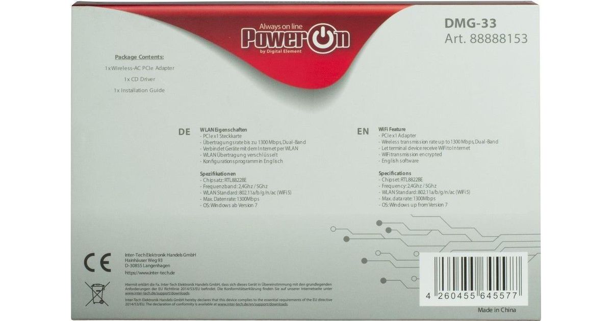 Inter-Tech DMG-33, Sisäinen, Langaton, PCI Express, WLAN, Wi-Fi 5 (802.11ac), 1300 Mbit/s