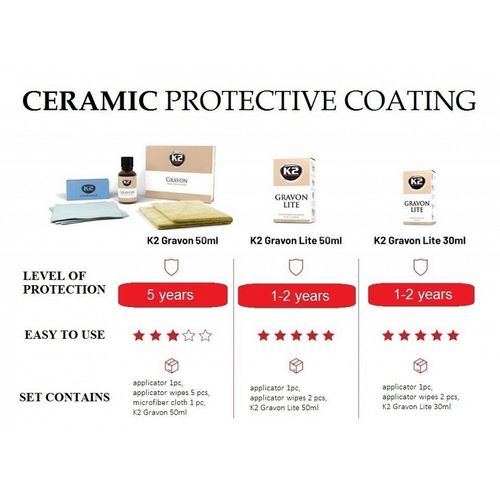 Keraamiline pinnakaitsevahend. mis kaitseb pinda kriimustuste. mustuse. UV-kiirguse. soolade. lindude väljaheidete. saasteainete. putukajääkide. korrosiooni ja mehaaniliste kahjustuste eest kuni 5 aastaks. Tänu keraamilisele pinnakattele ei ole vaja autot enam vahatada. Veelgi enam. tänu suurepärastele isepuhastuvatele omadustele tõrjub see efektiivselt mustust. mistõttu väheneb vajadus autot nii tihti pesta. Vastupidiselt vahadele ei ole keraamiline pinnakaitse kemikaalidega eemaldatav. Ainus viis katte eemaldamiseks on masinpoleerimine. Keraamiline pinnakate kaitseb efektiivselt pinda ka grafiti ja teiste värvikahjustuste eest. kuna värv ei kinnitu pinnale ja seda on kerge sealt eemaldada. K2 GRAVON sobib kasutamiseks ka teistel pindadel nagu kumm. plast. metall ja klaas. Keraamiline pinnakaitse on hetkel maailmas kõige tuntum ja vastupidavam pinnakaitsevahend. mis annab pinnale tunduvalt parema kaitse kui lakk. Pinnale moodustub 2-3 mikroni paksune keraamiline kiht. mis isoleerib pinna täielikult väliste mõjude eest.
