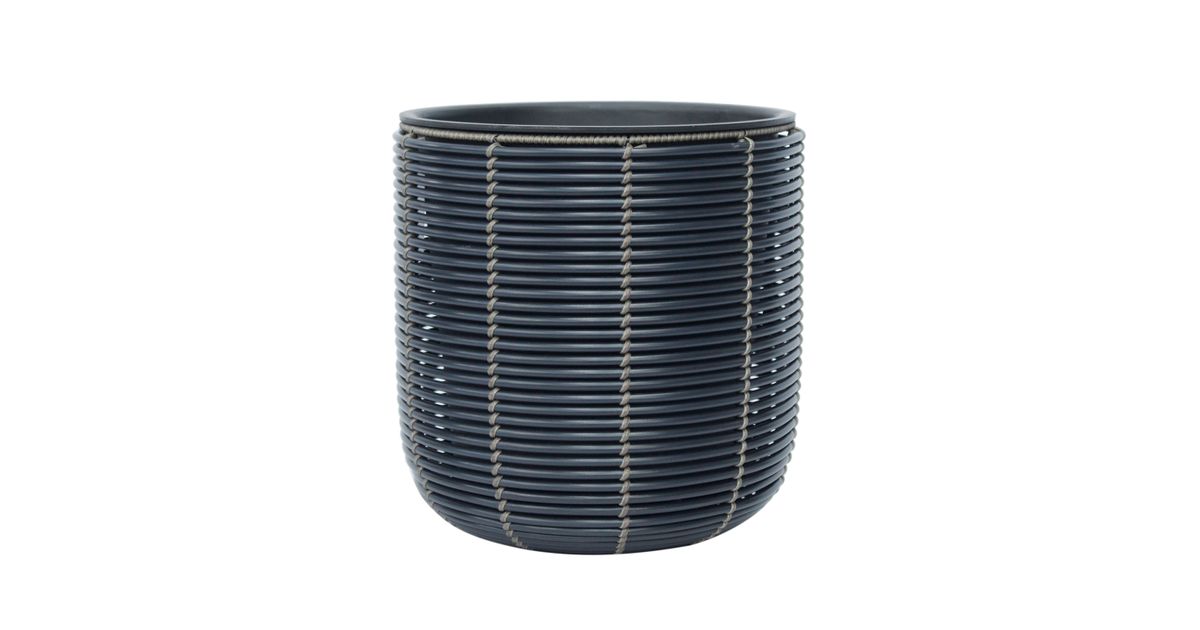 Kukkaruukku WICKER D35xH36cm, musta. Kukkaruukun metallirunko on päällystetty muovipunolla. Muovisen sisäruukun mitat ovat D30xH30cm. Sisäruukku on ilman reikää.