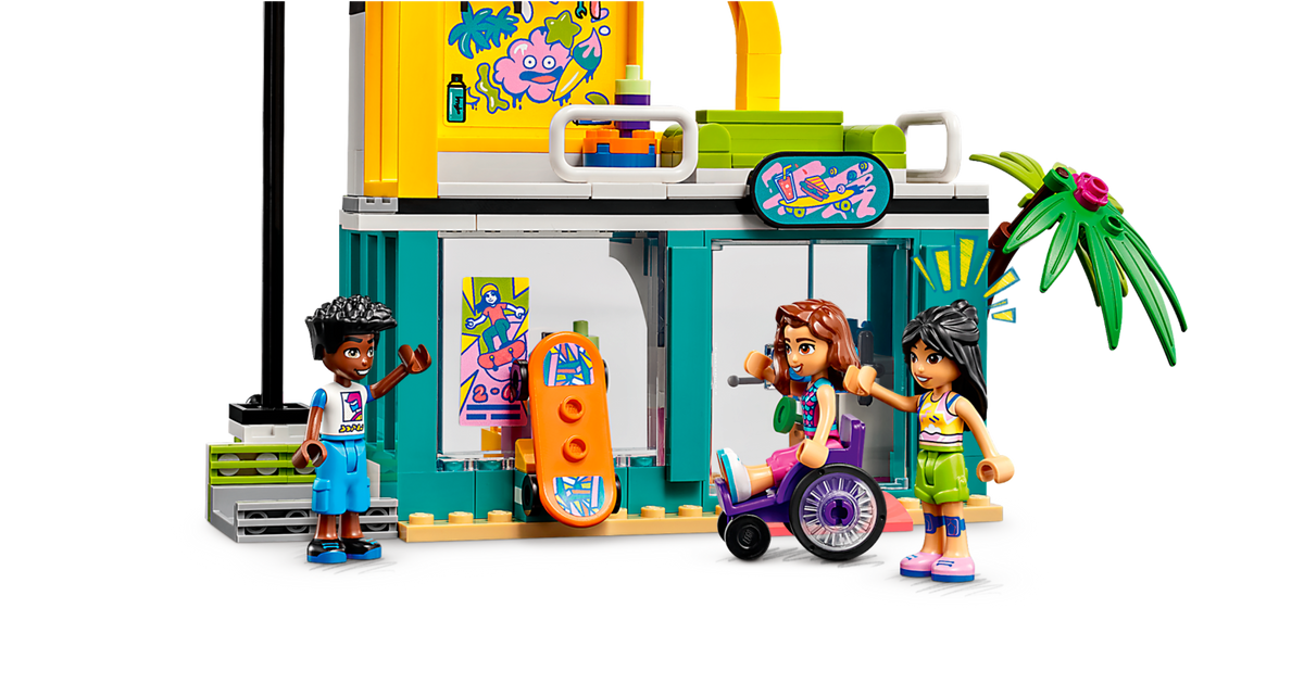 - Kolm mininukku ja tarvikud – komplektis on LEGO® Friends tegelaskujud Liann, Zac ja Luna, rambid, reelingud, rulluisud, rula, tõukeratas, Luna ratastool ja igale tegelaskujule kiiver
