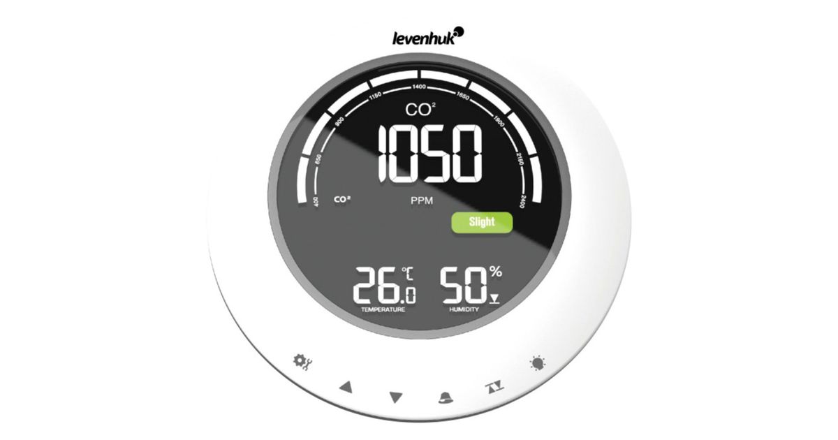 The Levenhuk Wezzer PLUS LP90 is a compact CO₂ meter that can also measure air temperature and humidity. The small device warns you when the CO₂ or humidity levels are too low or too high, making it uncomfortable to be in a room. If the carbon dioxide concentration exceeds the recommended value for ventilable rooms, the unit warns you to ventilate the room. There are digital warnings on the LCD colour display and audible warnings. You can also switch off the acoustic signal.