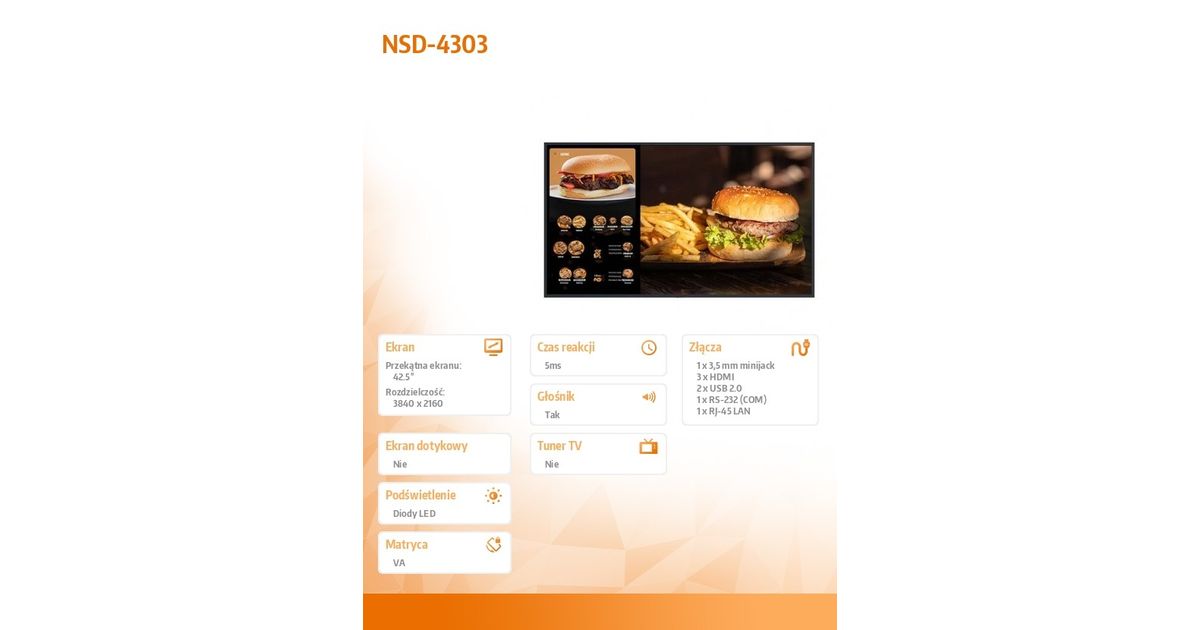 • Monitor 43 cale NSD-4303 VA 4K UHD 3xHDMI 2xUSB2.0 1xRS-232 1xRJ-45LAN SPEAKERS ANDROID LANDSCAPE PORTRAIT