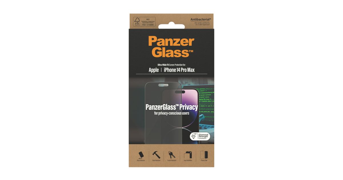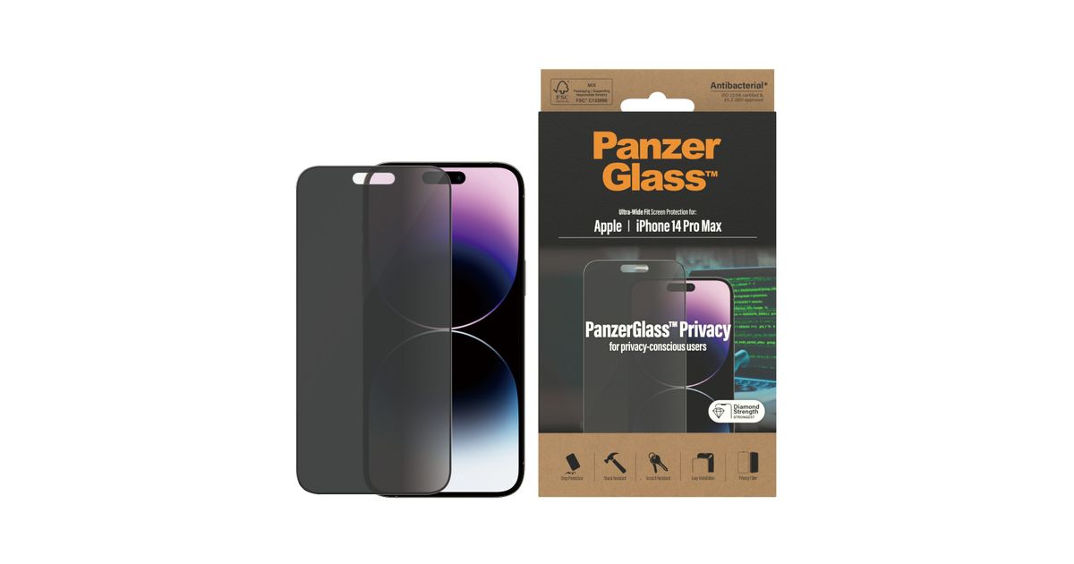 PanzerGlass iPhone 14 Pro Max - Privacy, Apple, Apple - iPhone 14 Pro Max, Asennus kuivana, Naarmuuntumisenkestävä, Iskunkestävä, Antibakteerinen, Läpinäkyvä, 1 kpl