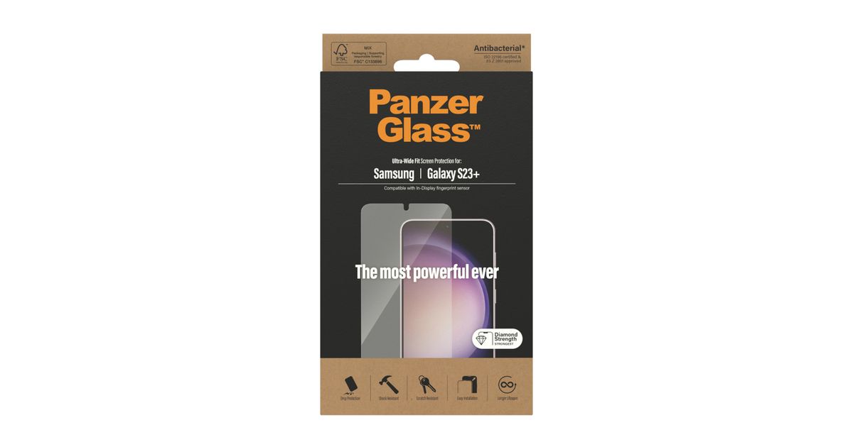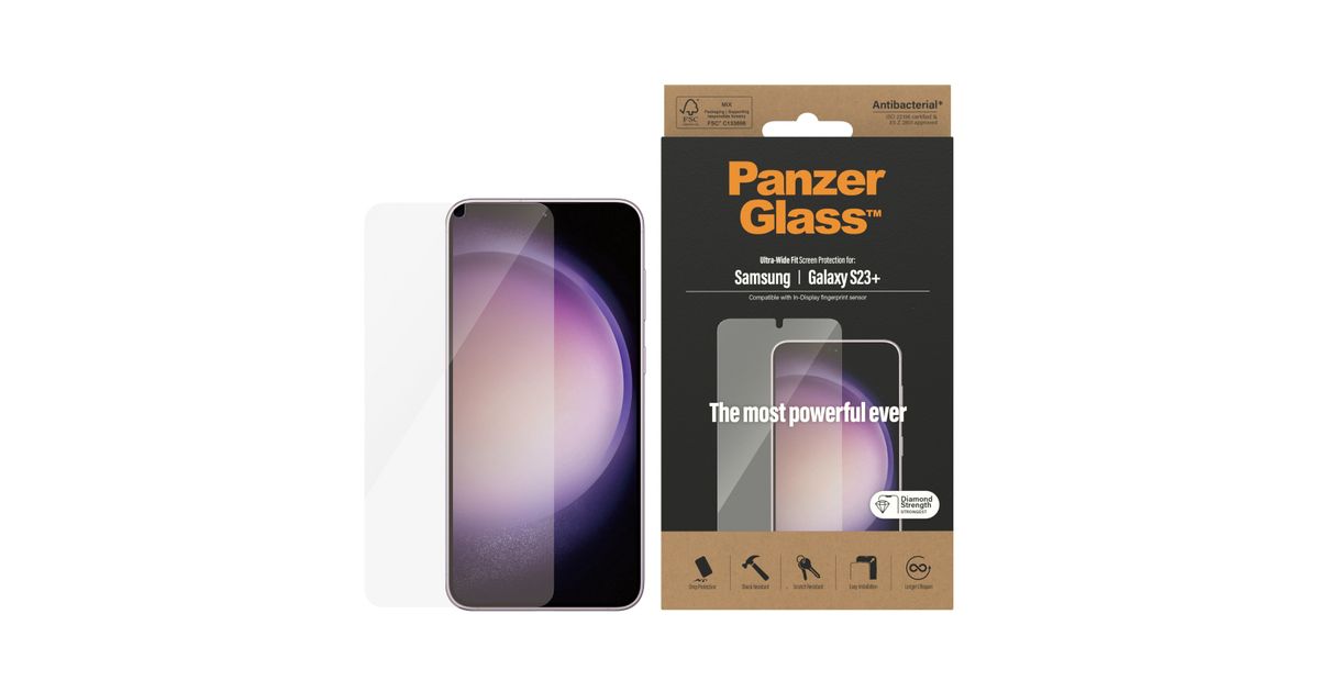 PanzerGlass Ultra Wide Fit, Samsung, Samsung - Galaxy S23+, Asennus kuivana, Naarmuuntumisenkestävä, Iskunkestävä, Antibakteerinen, Läpinäkyvä, 1 kpl