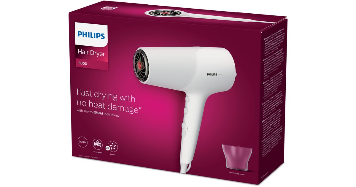 Philips 5000 series 2100 W ThermoShield-tekniikka Hiustenkuivain, DC, Valkoinen, Rispustusrengas, 1,8 m, 2100 W, 220 - 240 V